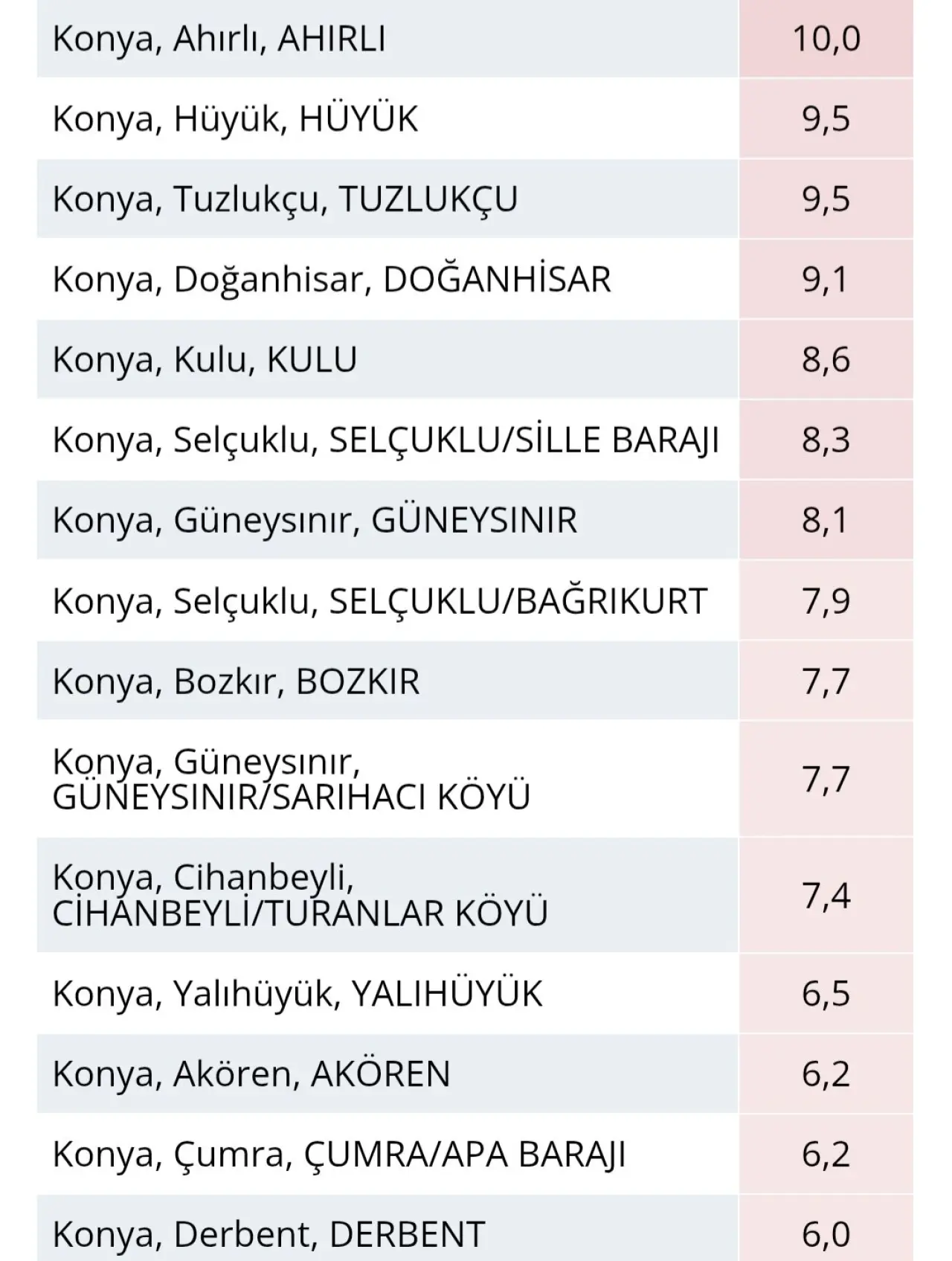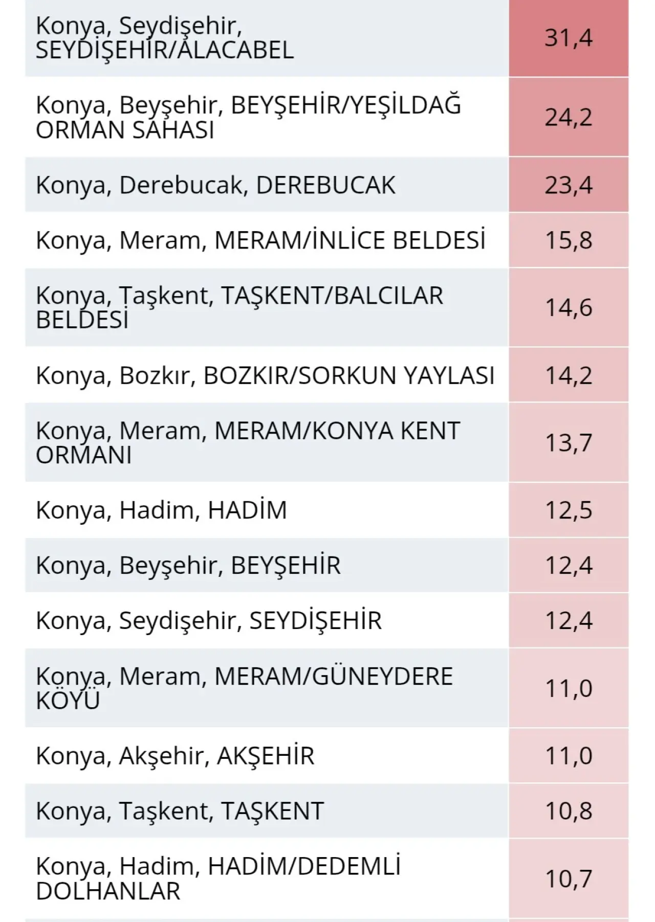 Meteorolojik verilere göre yağışın en yoğun görüldüğü noktalar arasında Beyşehir Yeşildağ Orman Sahası, Derebucak, Meram İnlice, Taşkent Balcılar ve Bozkır Sorkun Yaylası da yer aldı. Konya’nın özellikle dağlık ve yüksek kesimlerinde yağışın daha etkili olduğu görüldü.