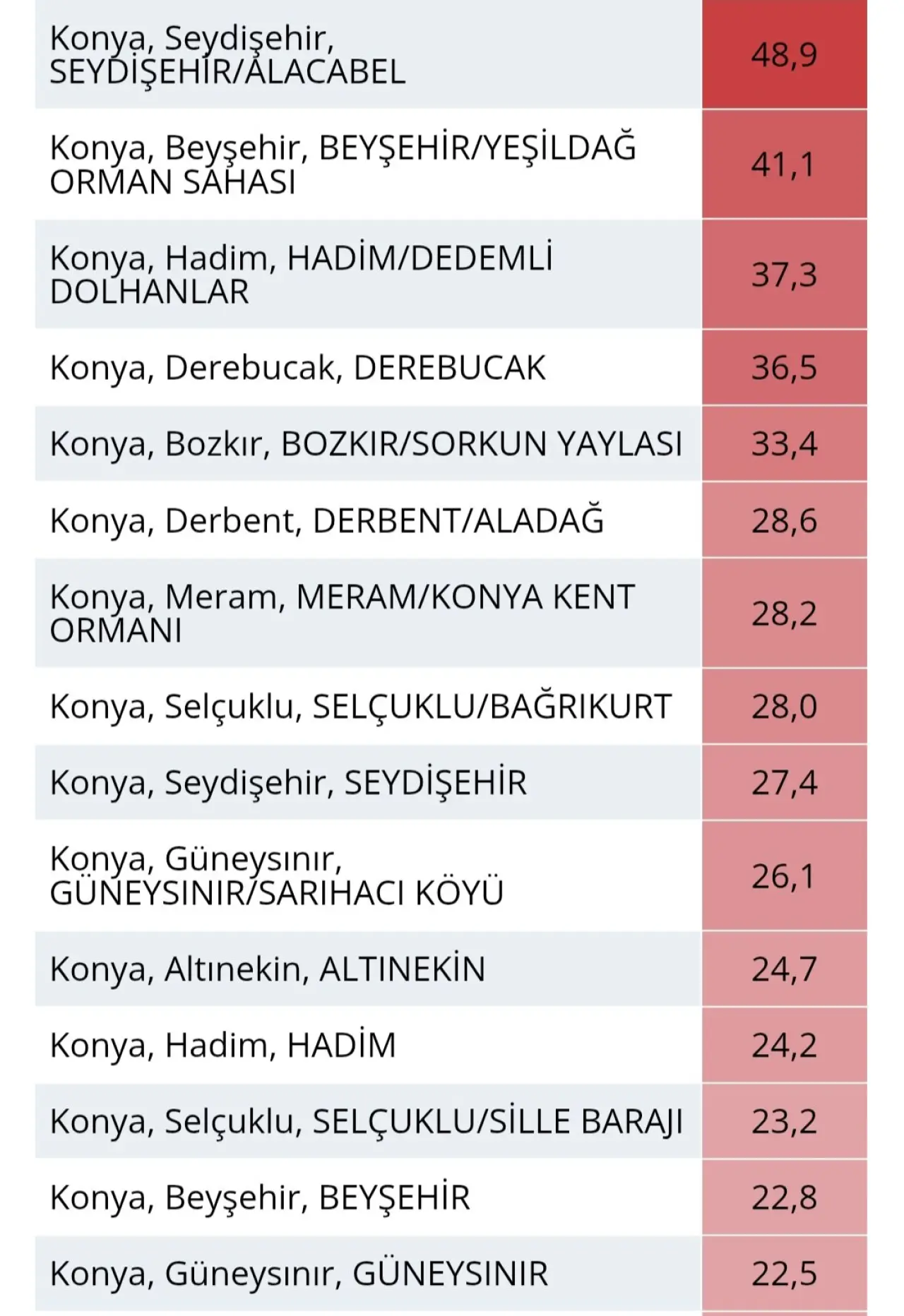 Konya genelinde etkili olan yağışlar, ilçelere göre büyük farklılık gösterdi. Yapılan ölçümlerde en fazla yağışın Seydişehir Alacabel mevkiinde kaydedildiği görüldü. Alacabel’de metrekareye 48,9 kilogram yağış düşerken, yüksek kesimlerde yağışın kar şeklinde etkili olduğu bildirildi.