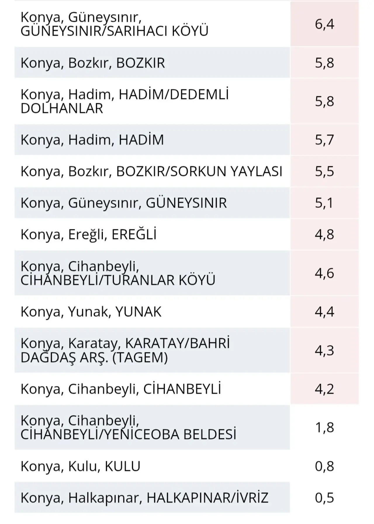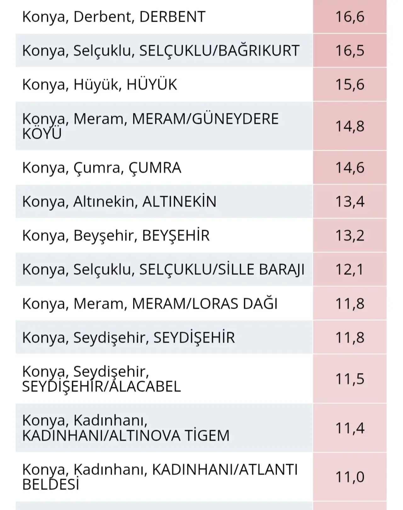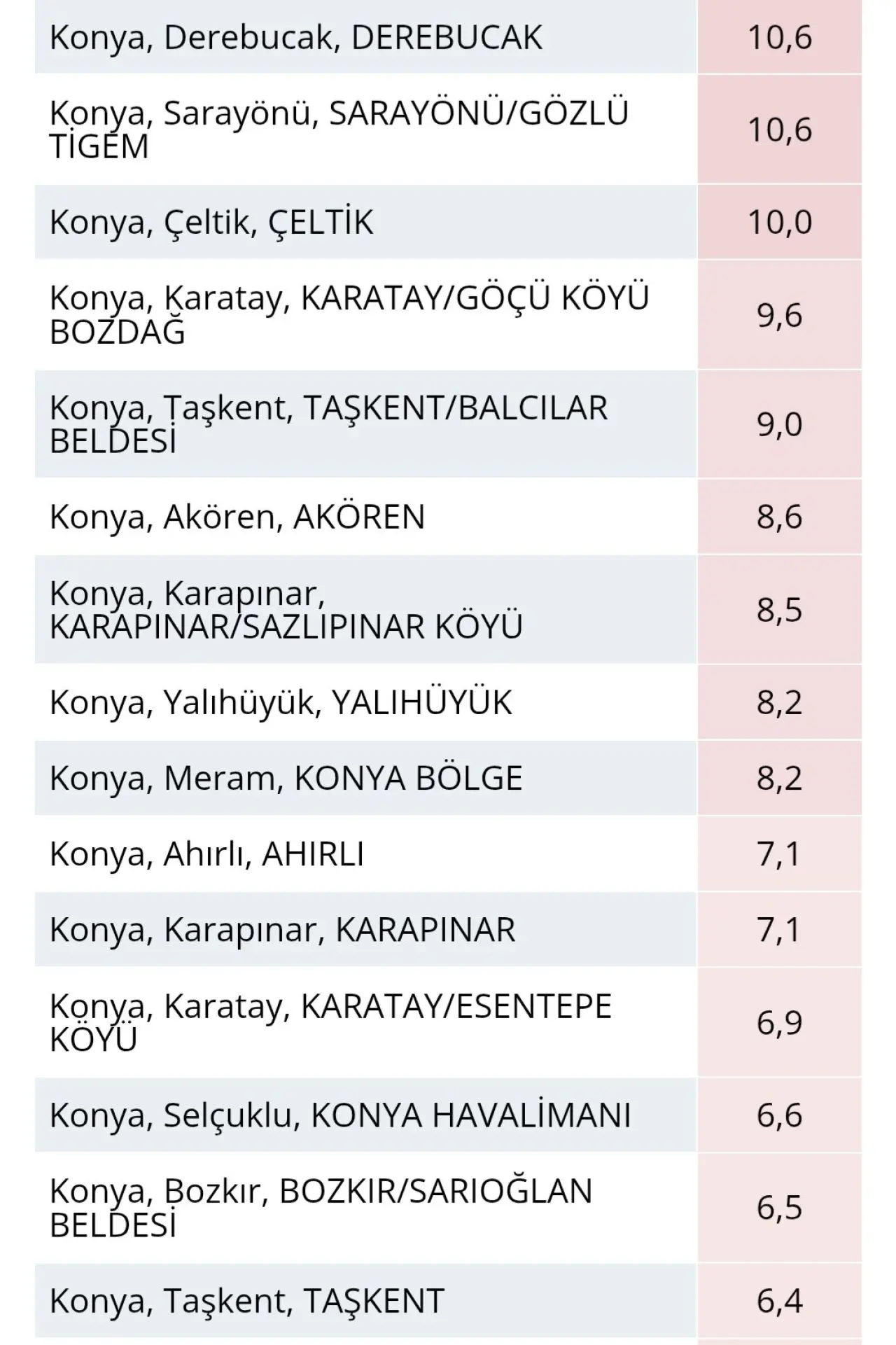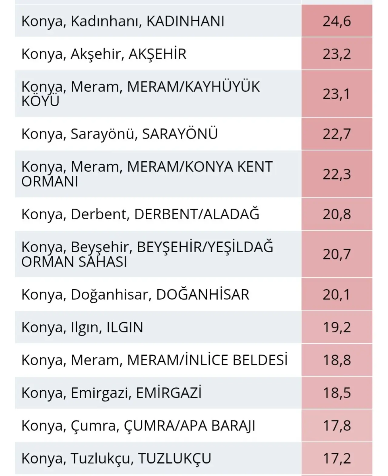 Listenin başında yağışın en yoğun hissedildiği bölgeler yer alıyor. Kadınhanı, metrekareye düşen 24,6 kg yağışla şehrin en çok su alan noktası olurken, onu 23,2 kg ile Akşehir ve 23,1 kg ile Meram/Kayhüyük Köyü takip etti.