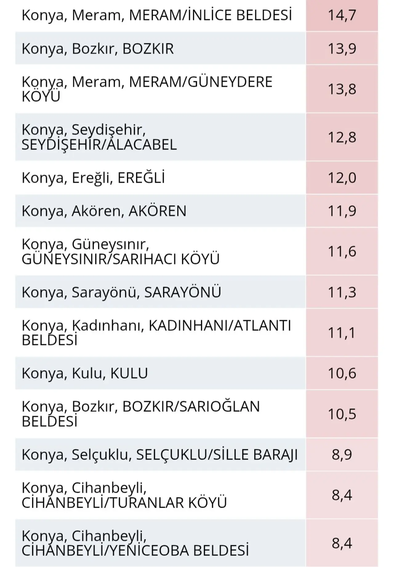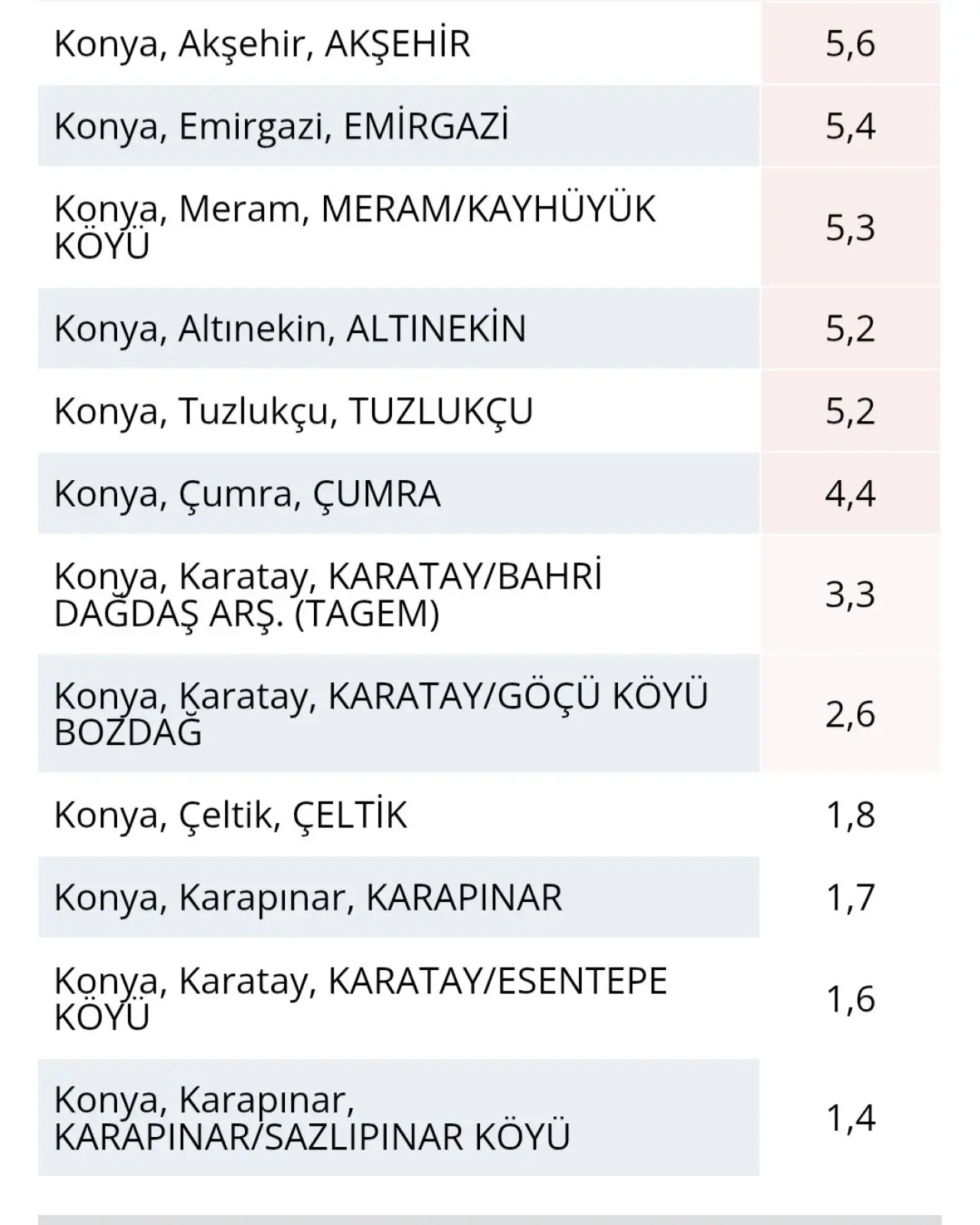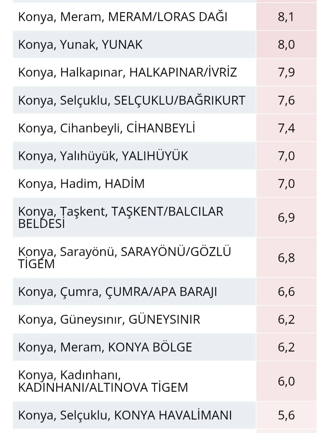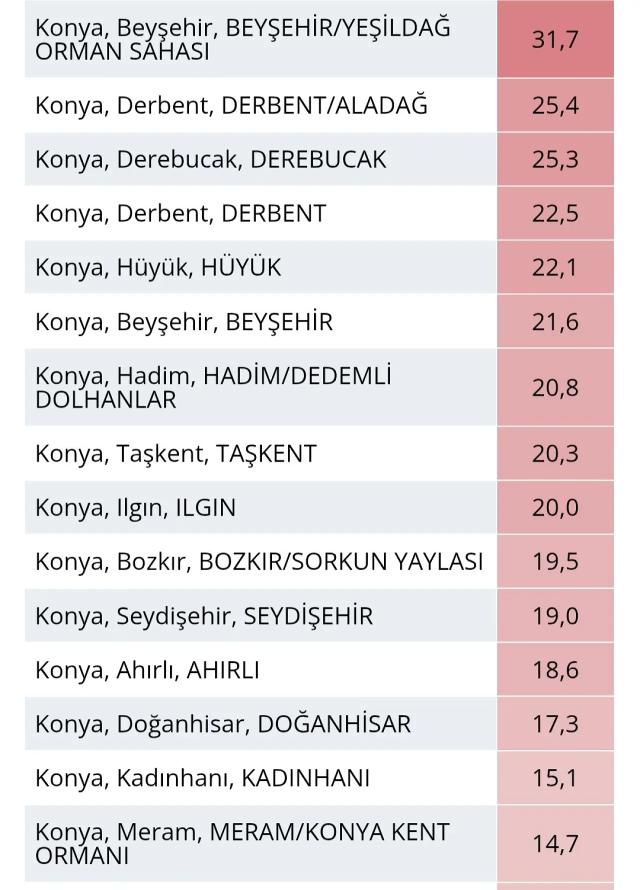 Paylaşılan verilere göre en fazla yağış Beyşehir Yeşildağ Orman Sahası’nda 31,7 kilogram olarak ölçülürken, Derbent Aladağ, Derebucak ve Hüyük çevreleri de yüksek yağış alan bölgeler arasında yer aldı.