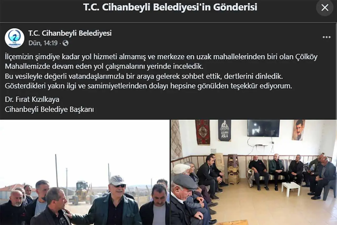 Konya Cihanbeyli Belediyesi’nin resmi sosyal medya hesabından CHP’li Cihanbeyli Belediye Başkanı Dr. Fırat Kızılkaya’nın ismiyle, “İlçemizin şimdiye kadar yol hizmeti almamış ve merkeze en uzak mahallelerinden biri olan Çölköy Mahallemizde devam eden yol çalışmalarını yerinde inceledik. Bu vesileyle değerli vatandaşlarımızla bir araya gelerek sohbet ettik, dertlerini dinledik. Gösterdikleri yakın ilgi ve samimiyetlerinden dolayı hepsine gönülden teşekkür ediyorum” paylaşımında bulunuldu.