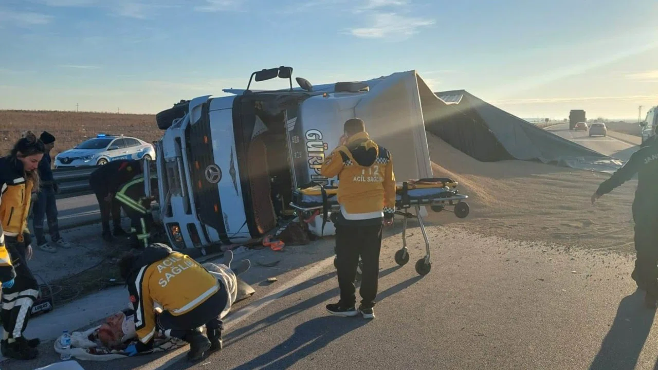 Kaza, Karapınar ilçesi Merdivenli mevkiinde meydana geldi. Edinilen bilgiye göre, E.G. (58) idaresindeki 20 AHY 747 plakalı Mercedes marka buğday yüklü tır, 06 DAB 923 plakalı dorsesinin lastiğinin patlaması sonucu kontrolden çıktı.