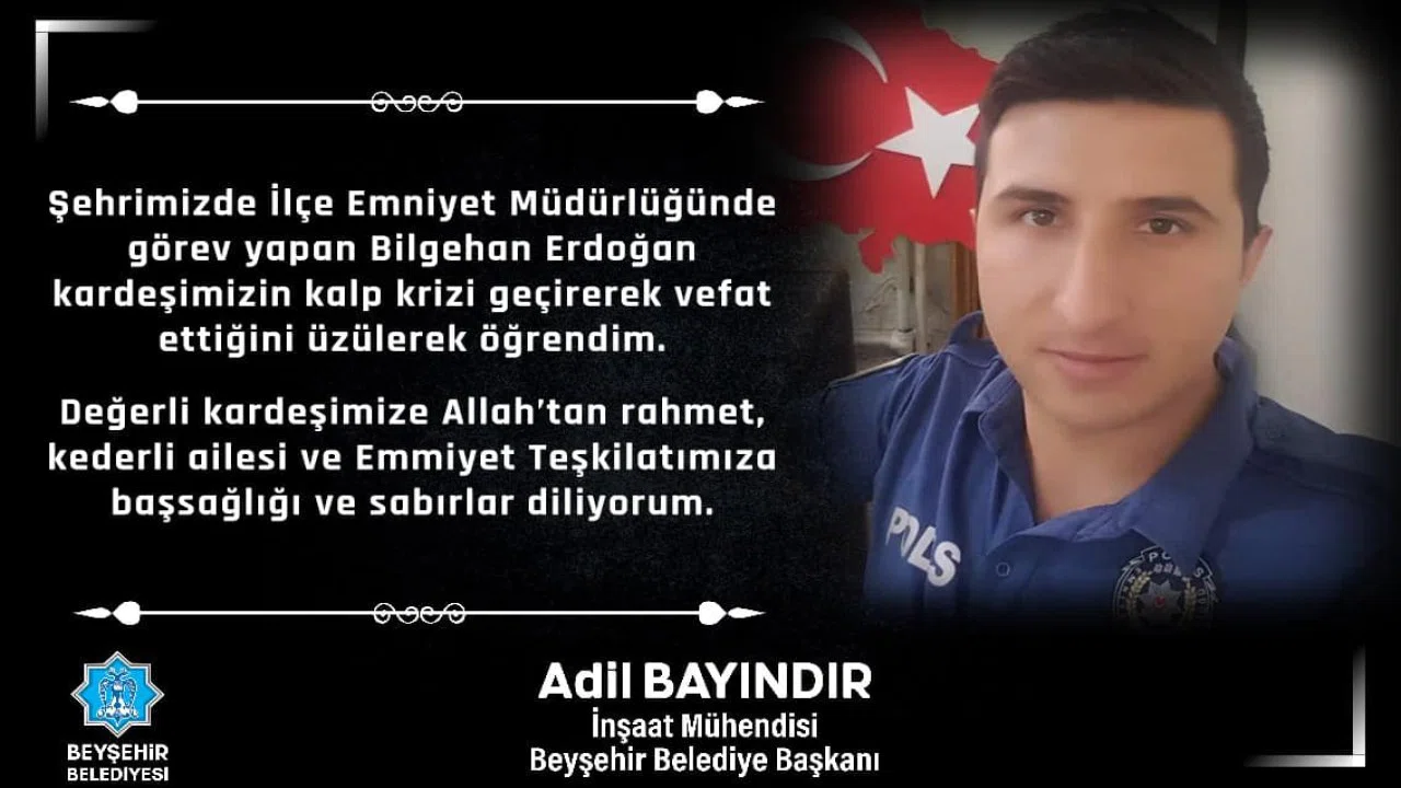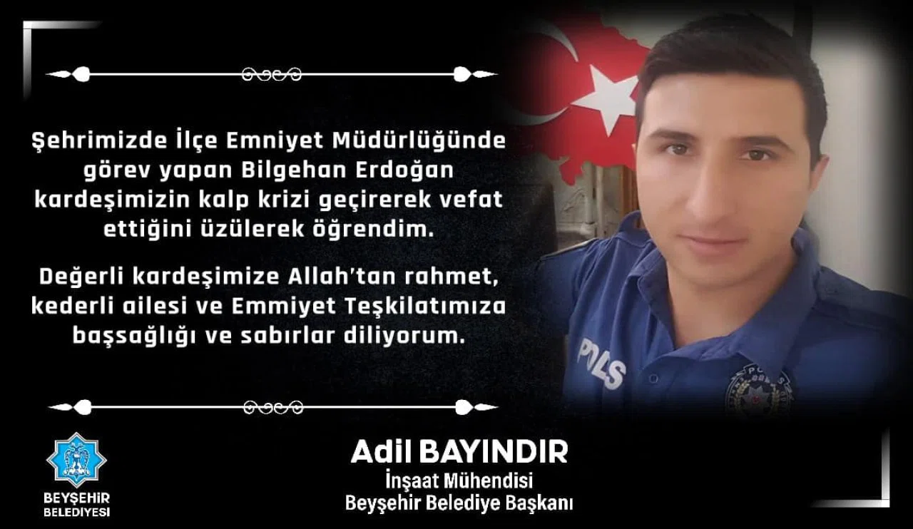 Beyşehir Belediye Başkanı Adil Bayındır, taziye mesajında, "Şehrimizde İlçe Emniyet Müdürlüğünde görev yapan Bilgehan Erdoğan kardeşimizin kalp krizi geçirerek vefat ettiğini üzülerek öğrendim. Değerli kardeşimize Allah'tan rahmet, kederli ailesi ve emniyet teşkilatımıza başsağlığı ve sabırlar diliyorum." ifadelerini kullandı.