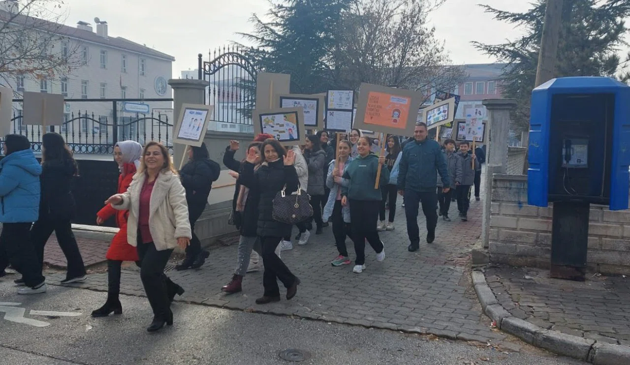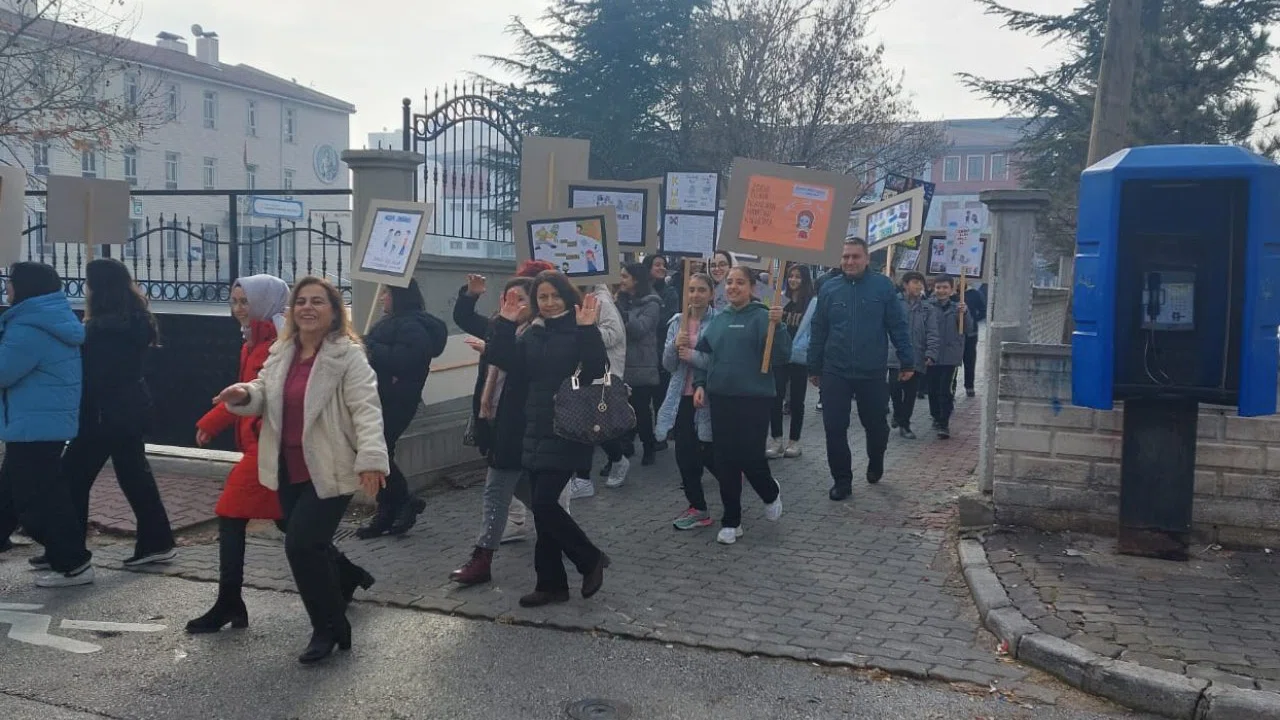 Okulda görev yapan rehber öğretmenler, okul aile birliği üyeleri yanı sıra çok sayıda velinin de katıldığı yürüyüş, okul bahçesinden başlayıp Barış Caddesi boyunca 1 kilometre sürdü.