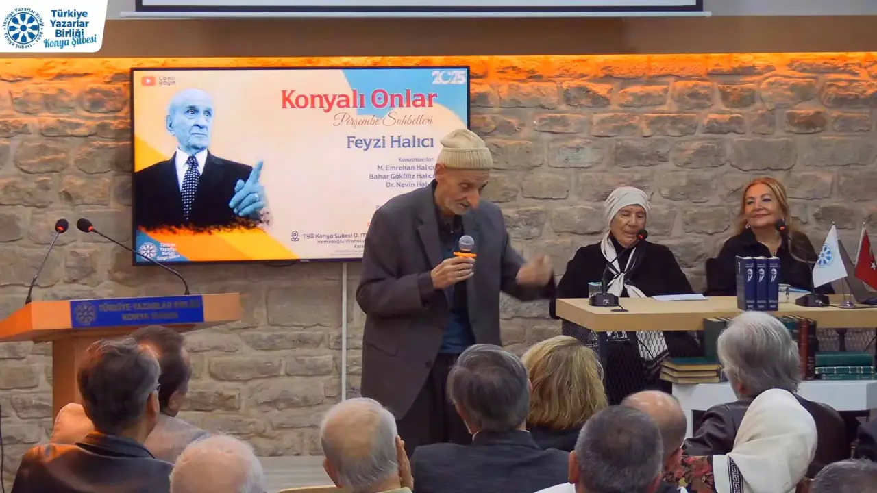 TYB Konya Şubesi D. Mehmet Doğan Kütüphanesi’nde düzenlenen programa Prof. Dr. Nuri Şimşekler moderatörlük yaptı. Feyzi Halıcı’nın ailesinden Bahar Gökfiliz Halıcı ve Dr. Nevin Halıcı konuşmacı olarak katıldı. Programa katılamayan oğlu Emrehan Halıcı’nın gönderdiği mektup da Şimşekler tarafından okundu.