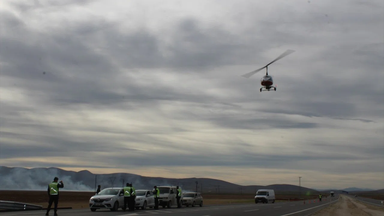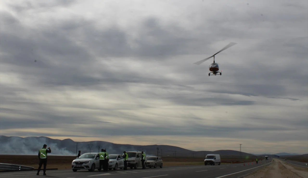 AA'dan alınan habere göre; Konya'nın Yunak ilçesinde jandarma ekiplerince "cayrokopter" destekli trafik denetiminde, kurallara uymadığı tespit edilen sürücülere cezai işlem uygulandı.