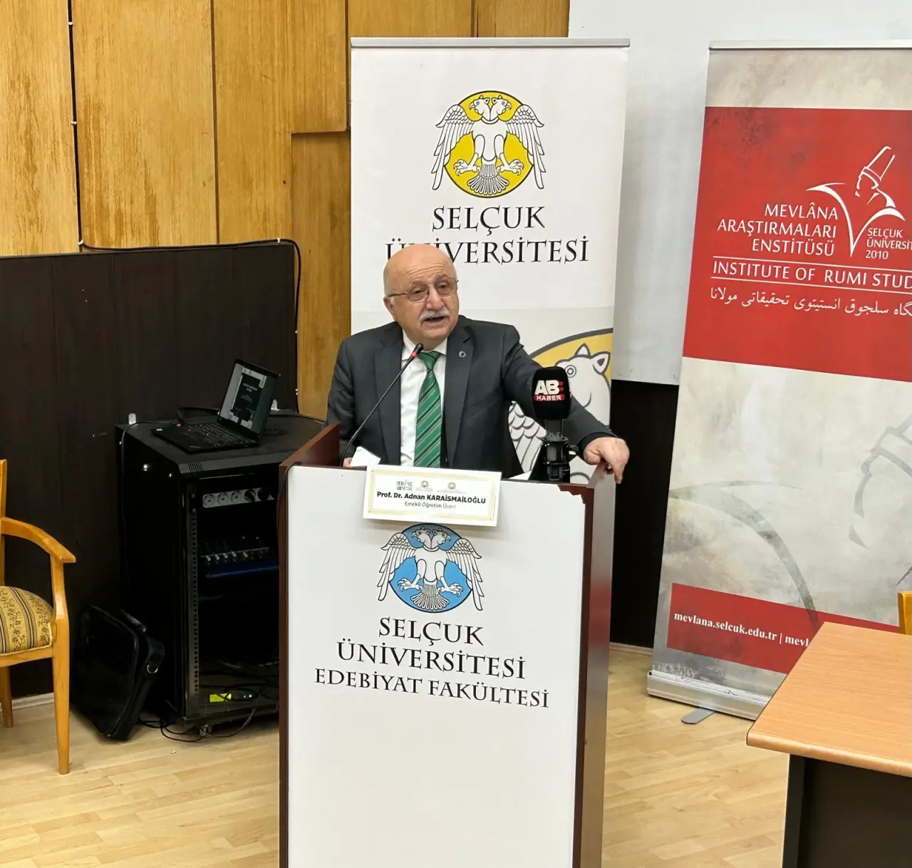 Selçuk Üniversitesi Mevlana Araştırmaları Enstitüsü ile Edebiyat Fakültesi iş birliğinde gerçekleştirilen konferansta, Prof. Dr. Adnan Karaismailoğlu Mevlana'nın gönül dünyası, edebi mirası ve çağlara aktarılan evrensel iletisini konuştu.