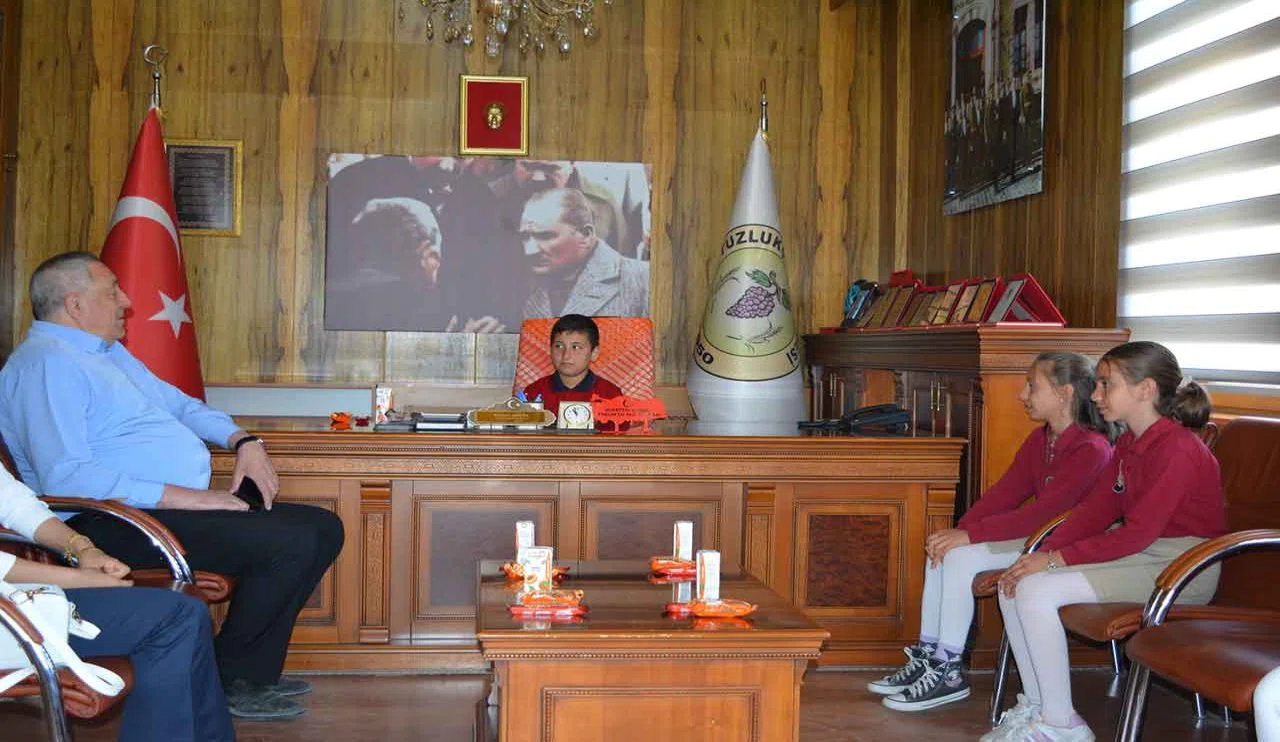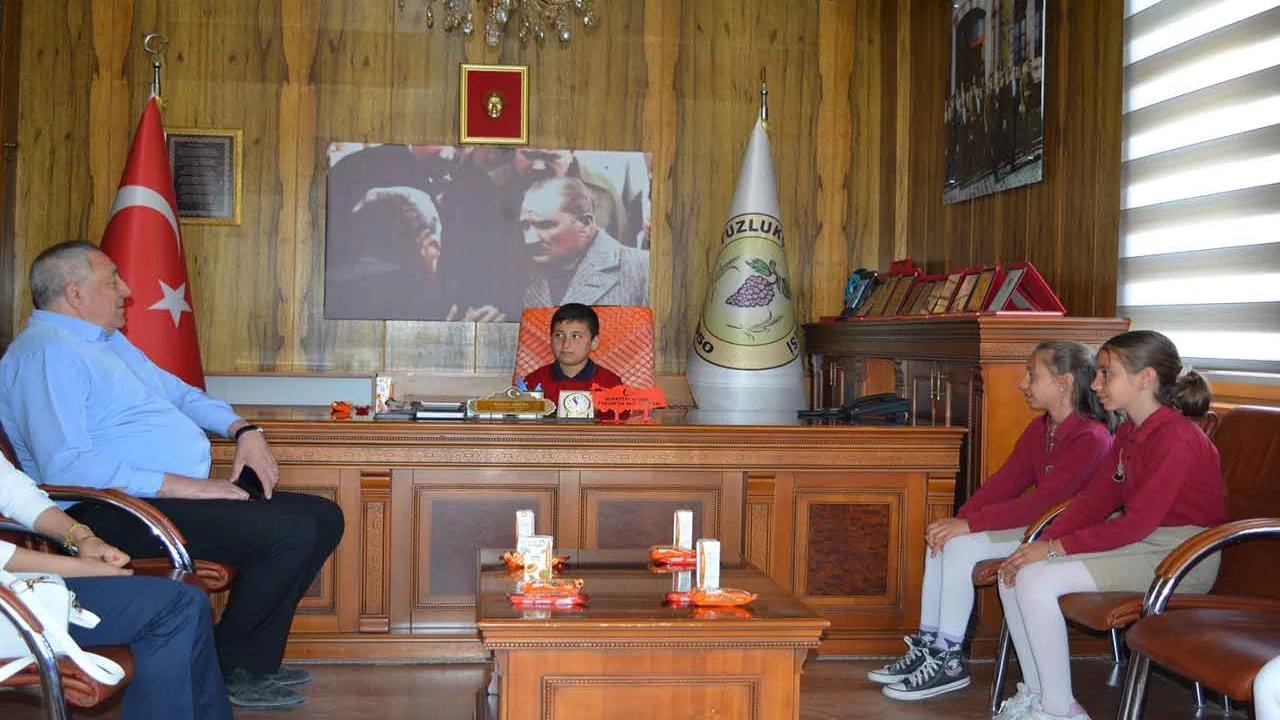 Misafirlerine çay ikram edip, sohbet eden Küçük Başkan Halil Hopa’ya okul arkadaşları Cansu Balcıoğlu, Cemile Dükkancı ve öğretmenleri de eşlik etti.
