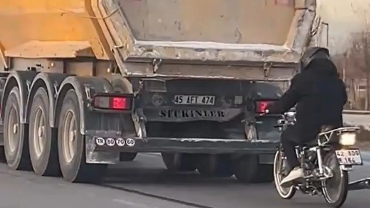 Konya’nın Selçuklu ilçesinde, Ankara Caddesi üzerinde seyir halindeki hafriyat tırını peşinden takip eden bir motosiklet sürücüsü, tehlikeli hareketleriyle yürekleri ağza getirdi. Olay, şehir merkezinden Ankara istikametine doğru ilerleyen tırın arkasında gerçekleşti. Motosiklet sürücüsü, tırın dorsesinin tamponuna zaman zaman yaklaşarak hem kendi güvenliğini hem de diğer sürücülerin güvenliğini ciddi şekilde riske attı.