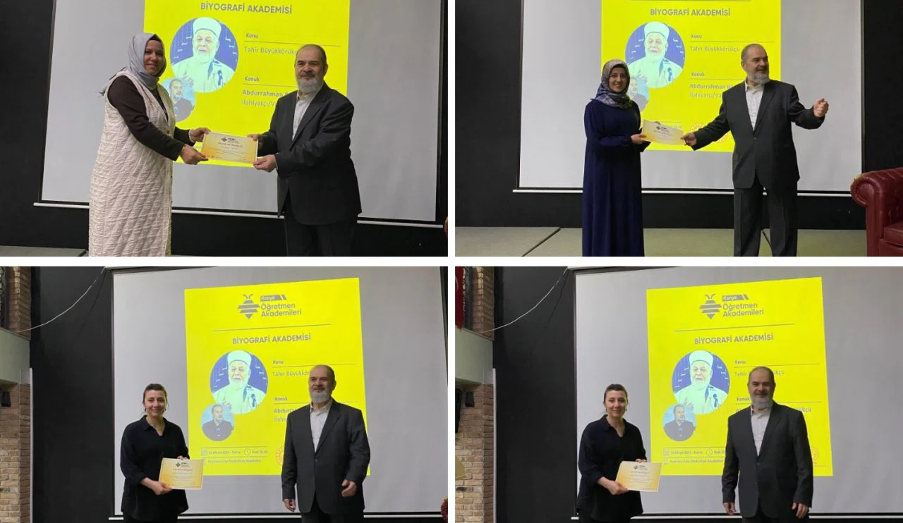 Konya Büyükşehir Belediyesi Keykavus Lise ve Medeniyet Akademisi Konferans Salonunda yapılan törende, İl Milli Eğitim Müdür Yardımcısı Aynur Türkoğlu, İl Milli Eğitim Şube Müdürü ve Konya Öğretmen Akademileri İl Koordinatörü Servet Altuntaş ve Tahir Büyükkörükçü merhumun oğlu Vaiz Abdurrahman Büyükkörükçü tarafından öğretmenlerimize “Akademi Belgesi” takdim edildi.