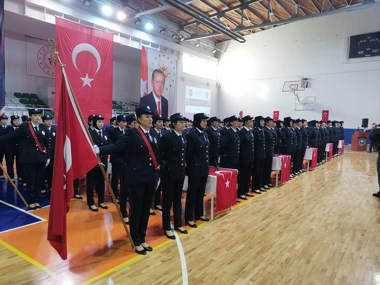 Ereğli Atatürk Spor Salonu'nda düzenlenen törene, Konya Valisi Vahdettin Özkan, Karaman Valisi Tuncay Akkoyun, Ereğli Kaymakamı Edip Çakmak, Karaman İl Emniyet Müdürü Ayhan Taş, Ereğli İlçe Emniyet Müdürü Murat Çakır, POMEM Müdür Vekili Yalçın Kaya ve mezun olan polislerin aileleri katıldı.