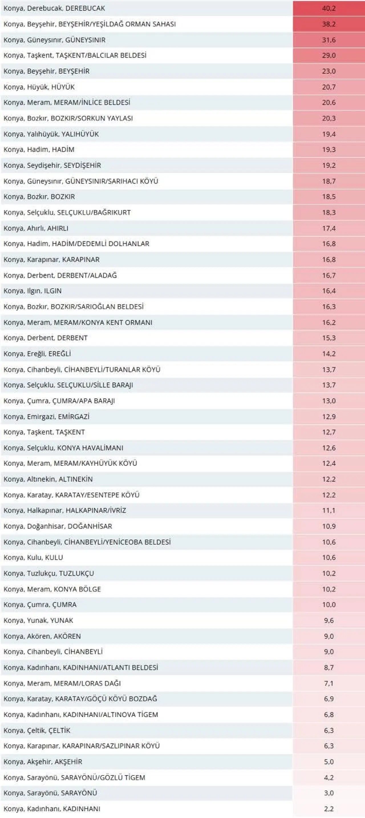 Konya genelinde etkili olan yağışların ardından Meteoroloji verilerine göre ilçe ilçe yağış miktarları belli oldu. Listenin zirvesinde Derebucak yer aldı.