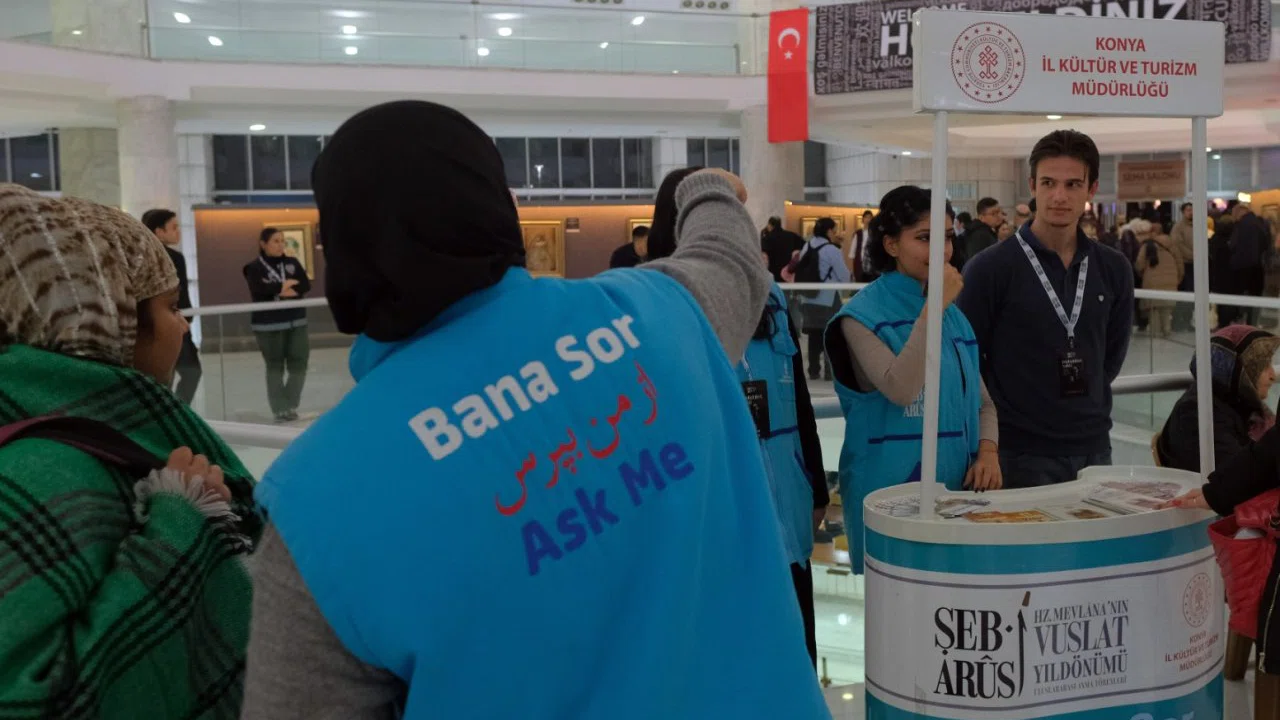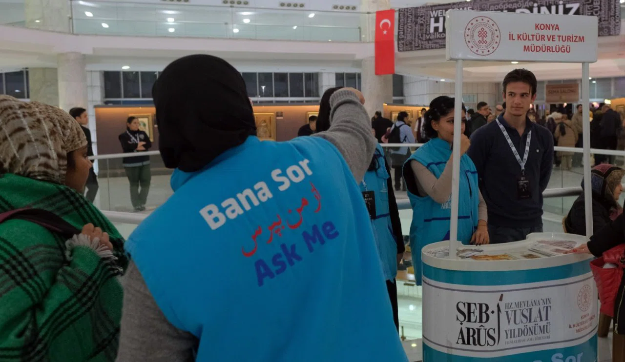 7-17 Aralık tarihleri arasında düzenlenen Şeb-i Arus etkinlikleri, Konya Valiliği, Kültür ve Turizm Bakanlığı ile Konya Büyükşehir Belediyesi iş birliğiyle yürütülüyor. Her yıl olduğu gibi bu yıl da yurt içinden ve yurt dışından binlerce Mevlana dostu Konya’ya akın etti. Etkinliklerin düzenlendiği alanlar ve Konya’nın önemli turistik noktaları hakkında bilgi almak isteyen ziyaretçilere, “Bana Sor” danışmanlık hizmeti büyük kolaylık sağlıyor.