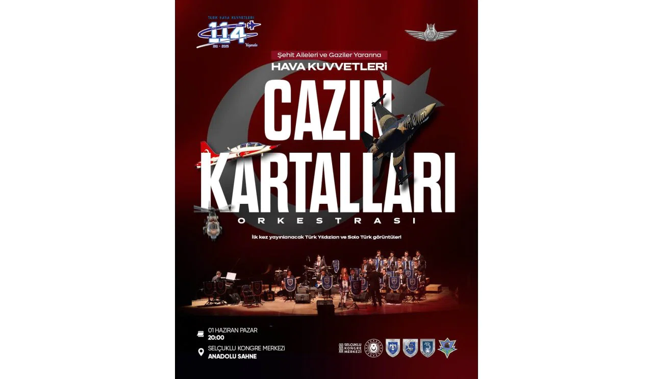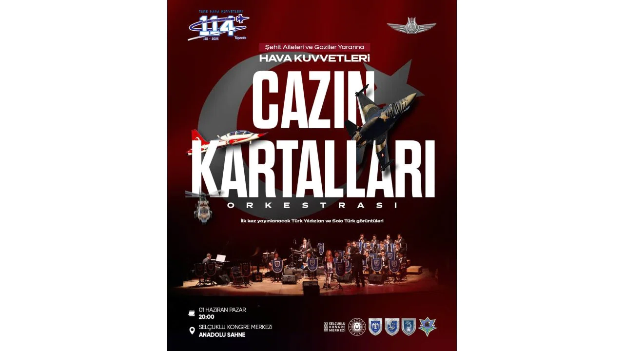 Türk Hava Kuvvetleri'nin 114. kuruluş yılı dolayısıyla Konya’da anlamlı bir konser düzenleniyor. Cazın Kartalları Orkestrası’nın sahne alacağı bu özel etkinlik, 1 Haziran Pazar günü saat 20.00’de Selçuklu Kongre Merkezi'nde gerçekleştirilecek.