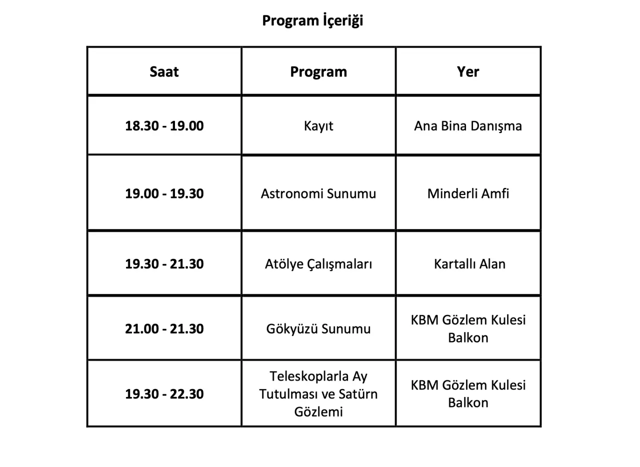 Konya Bilim Merkezi, gökyüzü tutkunlarını unutulmaz bir etkinliğe davet ediyor. 7 Eylül Cumartesi günü 18.30-22.30 saatleri arasında gerçekleşecek programda, teleskoplarla Ay tutulması ve Satürn gözlemi yapılacak. Ayrıca gökyüzündeki takımyıldızlar hakkında bilgiler paylaşılacak ve çeşitli atölye çalışmaları düzenlenecek.