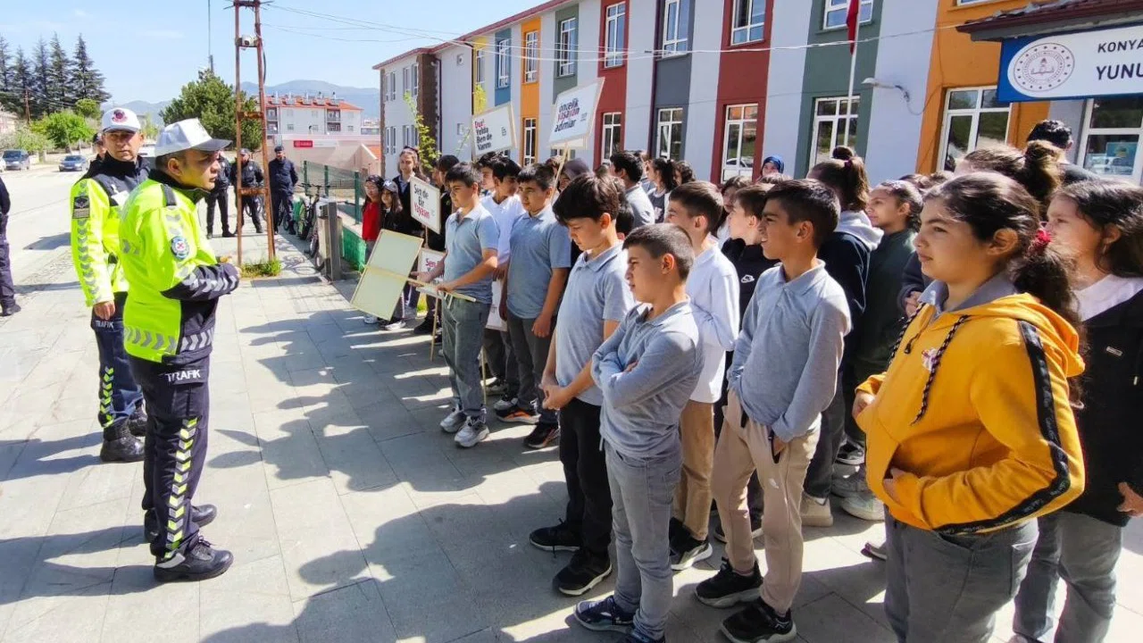 Yunus Emre Ortaokulu'nda gerçekleştirilen etkinlikte, Hüyük İlçe Jandarma Komutanlığı ve İlçe Emniyet Amirliği'nde görev yapan trafik ekipleri öğrencilere trafik kuralları hakkında eğitim verdi. Öğrencilere aynı zamanda eğitici broşürler de dağıtıldı.