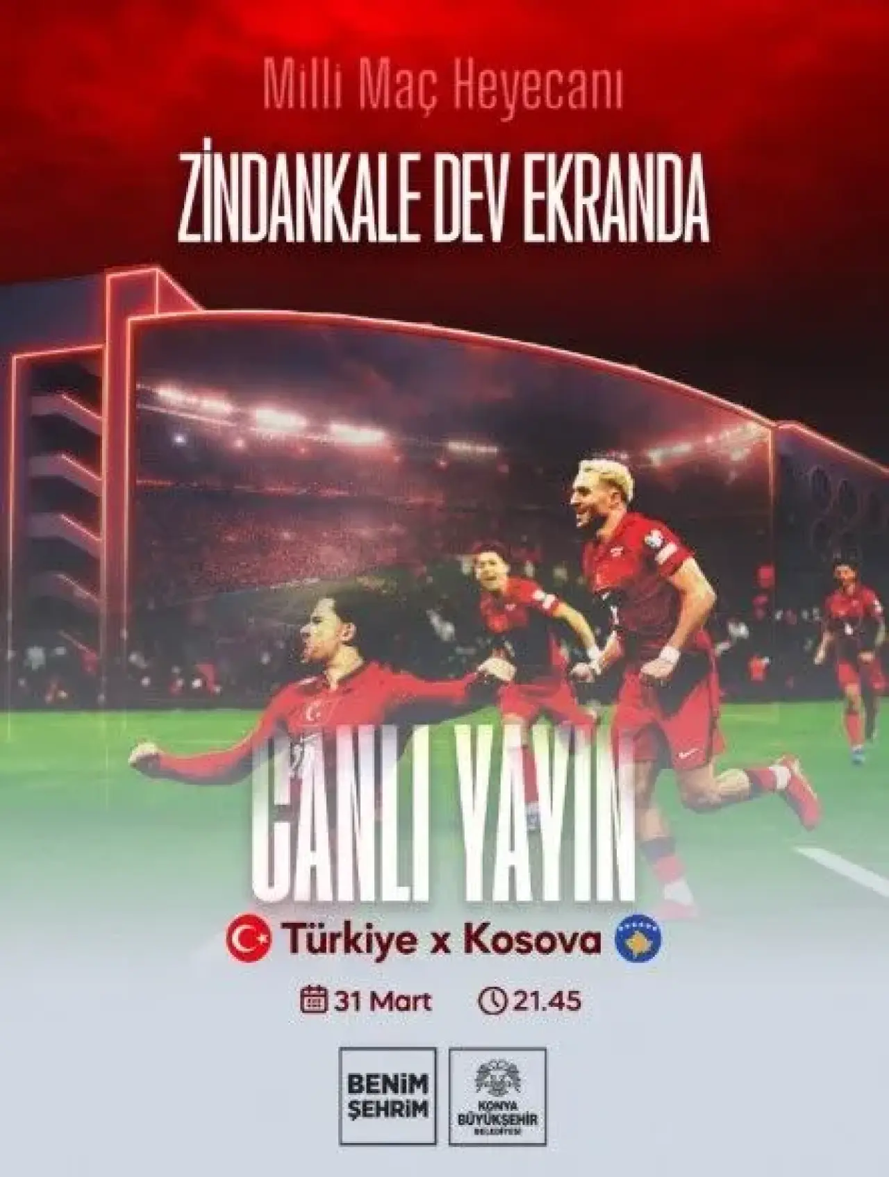 A Milli Futbol Takımı, deplasmanda Kosova ile karşı karşıya geliyor. Konya halkı, maçın heyecanını Zindankale LED ekranından birlikte yaşayacak.