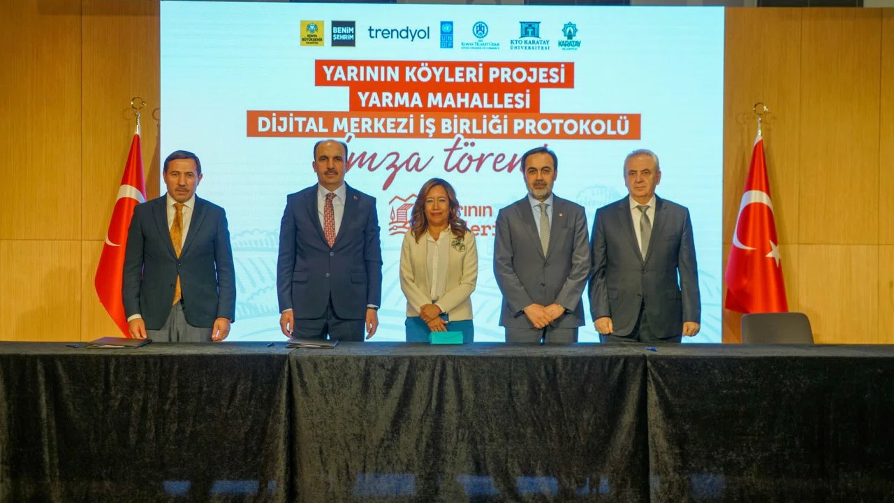Birleşmiş Milletler Kalkınma Programı (UNDP), Konya Büyükşehir Belediyesi, KTO Karatay Üniversitesi ve Karatay Belediyesi tarafından Trendyol sponsorluğunda hayata geçirilecek “Yarının Köyleri Projesi” Yarma Mahallesi Dijital Merkezi iş birliği protokolü imza töreni düzenlendi.