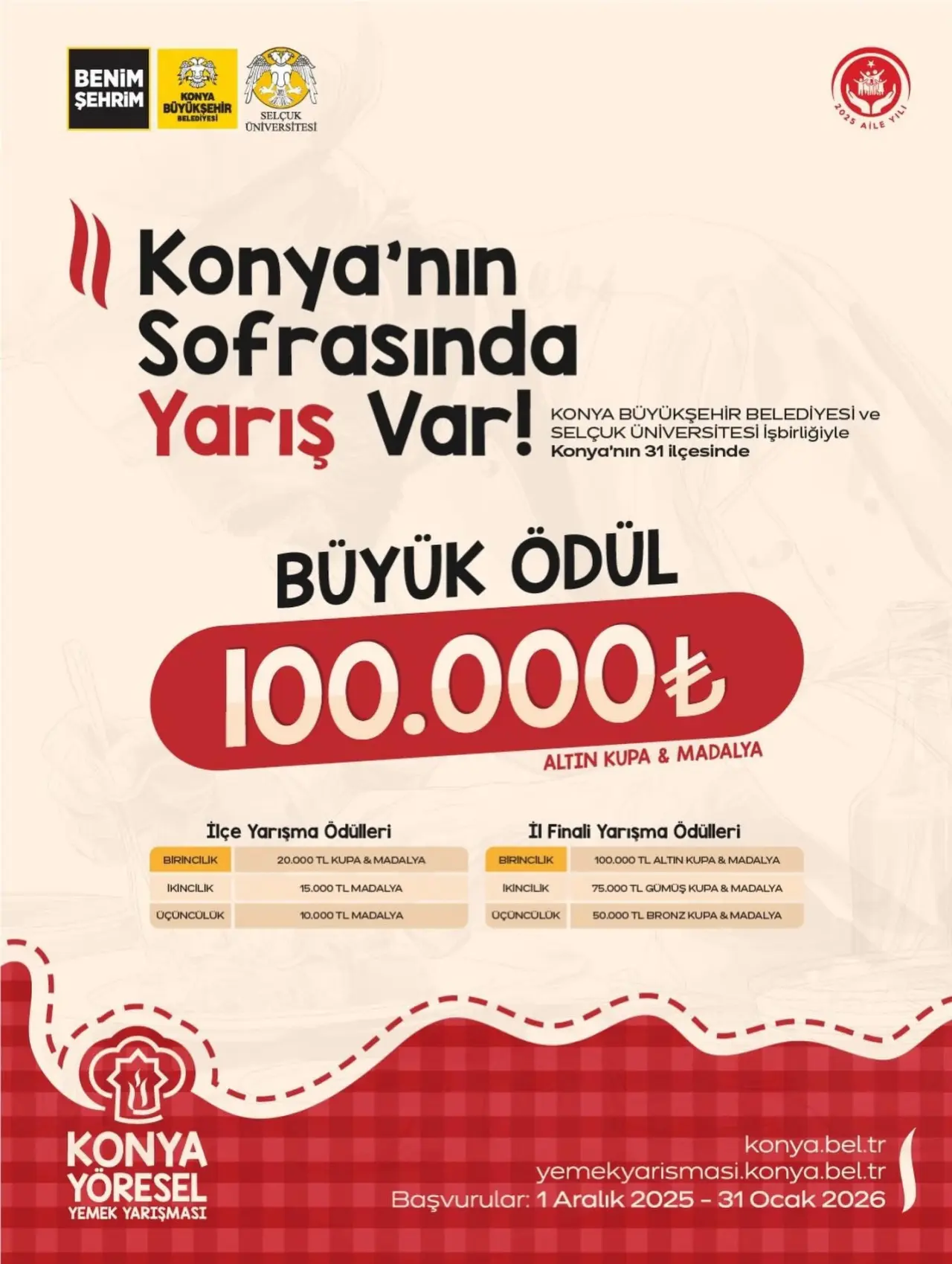 Yarışmaya katılmak isteyenler, 1 Aralık 2025 – 31 Ocak 2026 tarihleri arasında yemekyarismasi.konya.bel.tr adresi üzerinden başvurularını gerçekleştirebilecek.