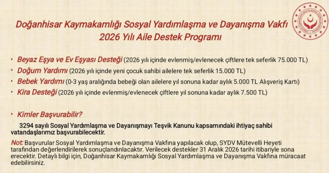 Cumhurbaşkanı Recep Tayyip Erdoğan tarafından ilan edilen 2025 Aile Yılı kapsamında, Doğanhisar Kaymakamlığı Sosyal Yardımlaşma ve Dayanışma Vakfı (SYDV) aracılığıyla ihtiyaç sahibi vatandaşlara yönelik yıl boyunca çeşitli aile destek programları hayata geçirildi.