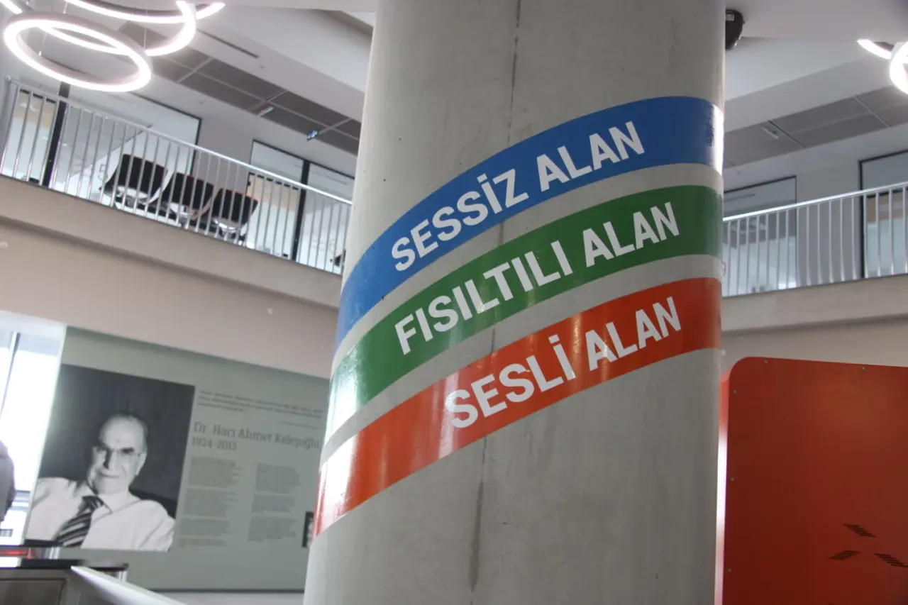 Ahmet Keleşoğlu Kütüphanesi’nin en dikkat çeken özelliklerinden birinin Türkiye’de ilk kez uygulanan “üç ses seviyesi ve renk yönetimi” sistemi olduğunu vurgulayan Özdemir, Mavi alanlar: Sessiz (huzur teması), yeşil alanlar: Fısıltılı (doğa teması), Turuncu alanlar: Sesli (enerji teması) olarak planlandığını söyledi. Renklerin psikoloji uzmanlarıyla birlikte belirlendiğini ifade eden Özdemir, bu çalışmanın literatüre kazandırıldığını dile getirdi.