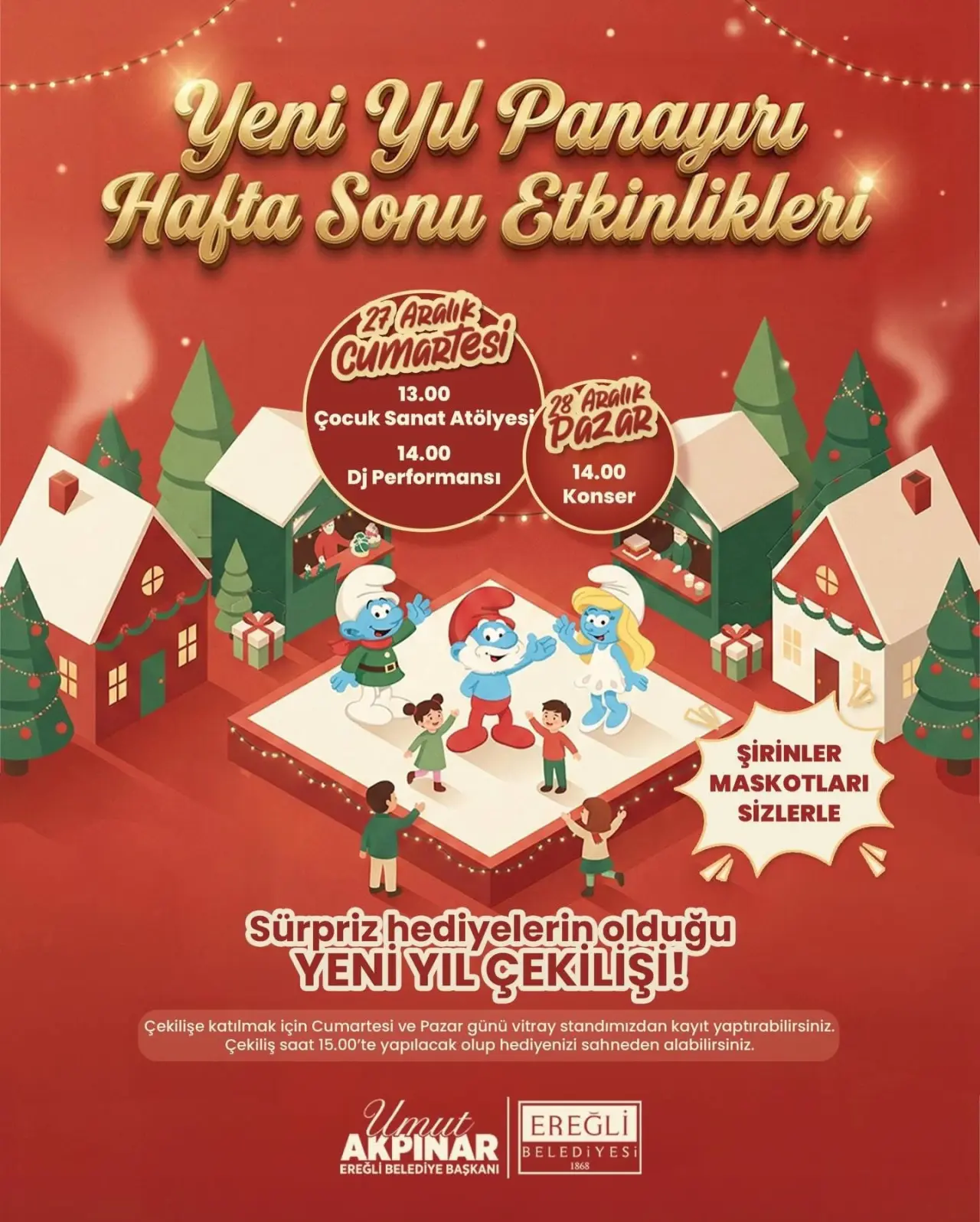 Konya’nın Ereğli ilçesinde, Oğuz Ata Sosyal Tesisleri içerisinde kurulan Yeni Yıl Panayırı, hafta sonu boyunca renkli etkinliklerle vatandaşları ağırlamaya devam ediyor. Şirinler maskotları, sürpriz hediyeli yeni yıl çekilişi ve çeşitli etkinliklerle özellikle çocuklar ve gençler için eğlenceli anlar yaşanıyor.