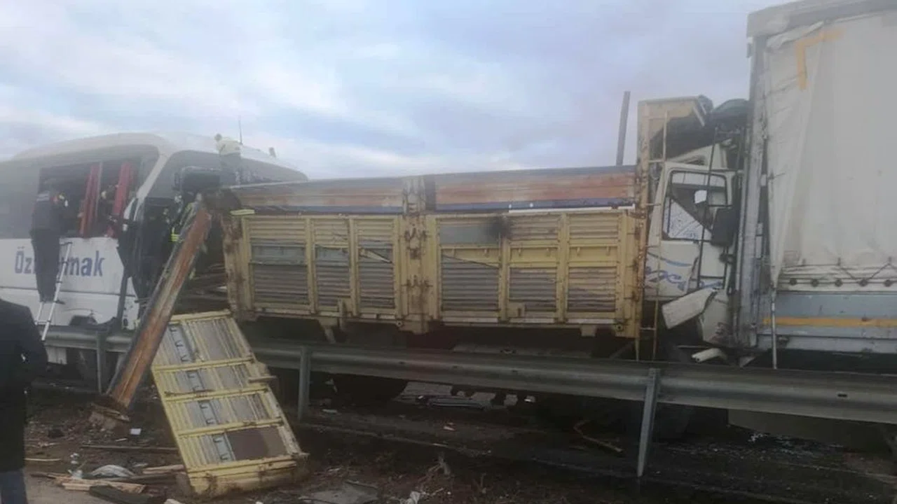 Yolcu otobüsü, TIR ve kamyonun karıştığı kazada 3 kişi yaşamını yitirdi, 33 kişi yaralandı.