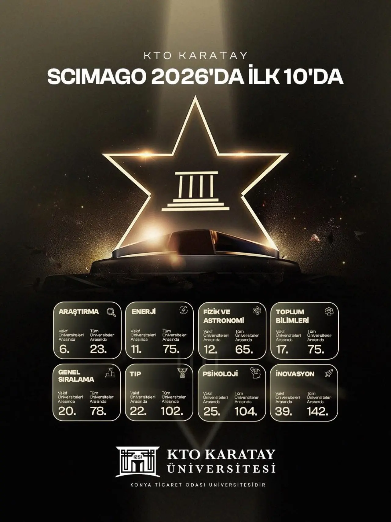 KTO Karatay Üniversitesi’nin elde ettiği bu sonuçlar, kurumun hem bilimsel üretim hem de akademik görünürlük bakımından yükselişini sürdürdüğünü ortaya koydu. SCImago verileri, üniversitenin özellikle araştırma performansında Türkiye genelinde üst sıralara yerleştiğini gösterdi.
