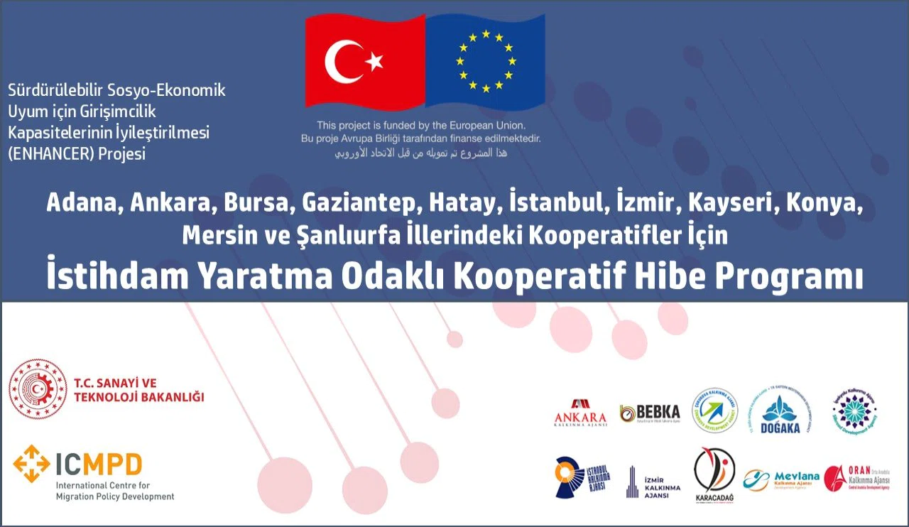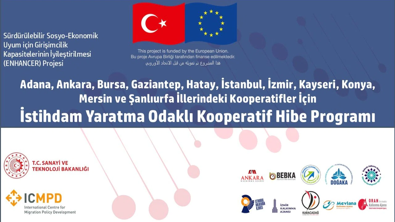 Uluslararası Göç Politikaları Geliştirme Merkezi (ICMPD) ve T.C. Sanayi ve Teknoloji Bakanlığı Kalkınma Ajansları Genel Müdürlüğü koordinasyonunda yürütülen ENHANCER (Sürdürülebilir Sosyo-Ekonomik Uyum İçin Girişimcilik Kapasitelerinin İyileştirilmesi) Projesi kapsamında, İstihdam Yaratma Odaklı Kooperatif Hibe Programı'nın 3. Çağrısı ilan edildi.
