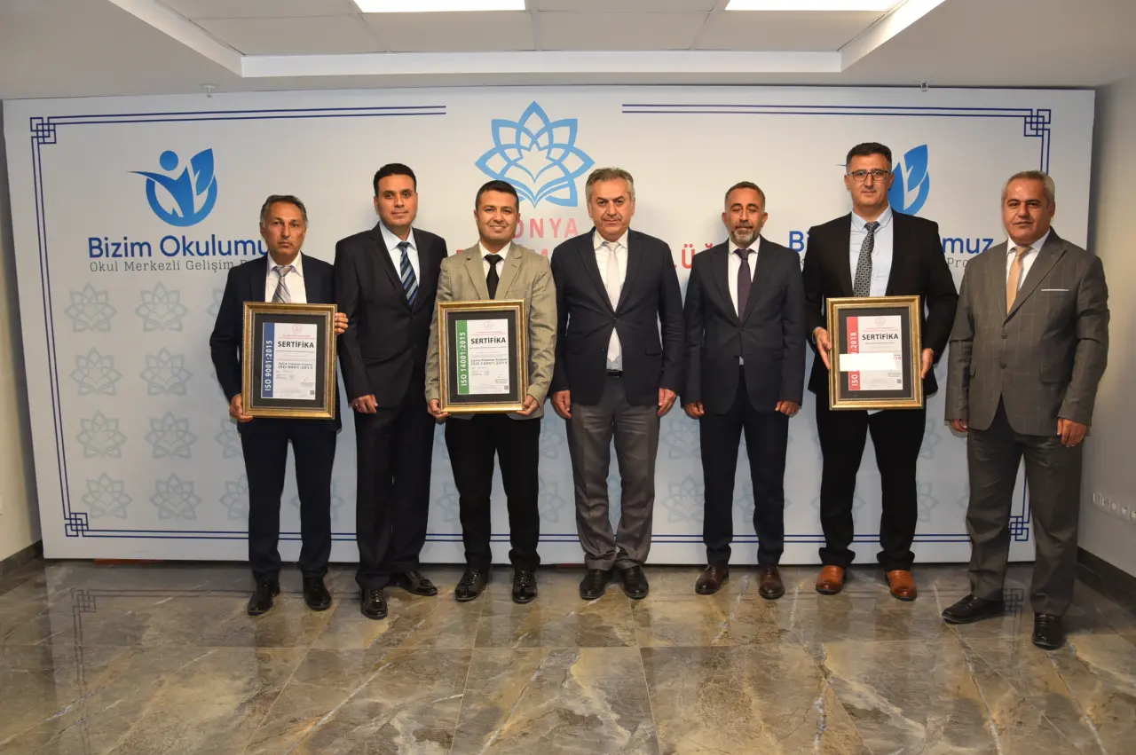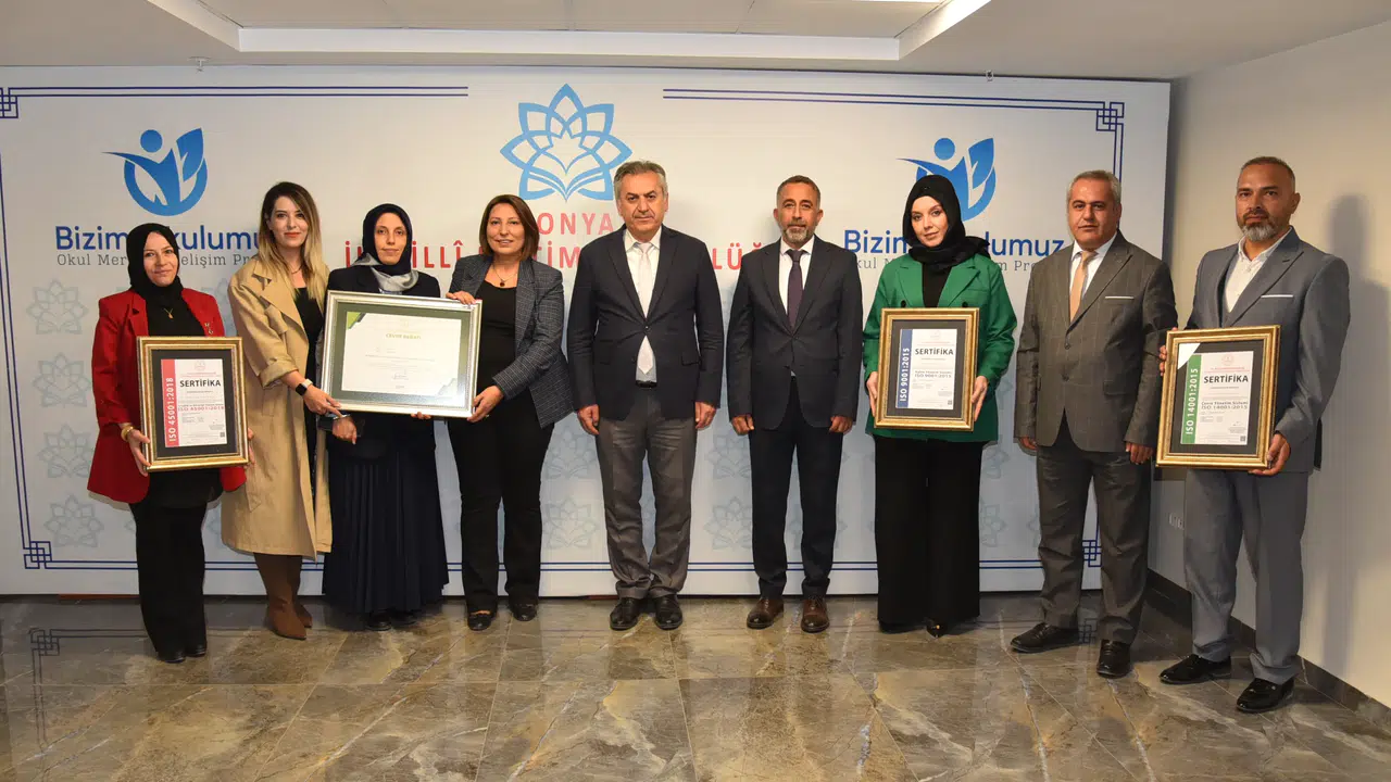 Konya İl Millî Eğitim Müdürlüğü toplantı salonunda 22 Ekim 2025 tarihinde düzenlenen törende, kalite yönetim sürecini başarıyla tamamlayan eğitim kurumlarına “ISO Yönetim Sistemleri” Sertifikası ve “Çevre Beratı” takdim edildi.