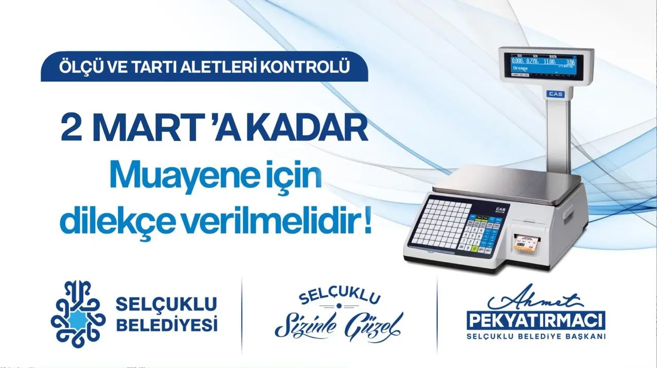 Belediyeden yapılan açıklamada, ticarette kullanılan veya mevcut bulunan her türlü ölçü ve tartı aletinin periyodik muayene, ayar ve damga işlemlerinin yaptırılması gerektiği hatırlatıldı. Bu kapsamda ölçü ve tartı aleti kullanan mükelleflerin, beyannamelerini 2 Mart 2026 tarihine kadar Selçuklu Belediyesi Grup Merkezi Ölçü ve Ölçü Aletleri Servisi’ne teslim etmeleri gerekiyor.