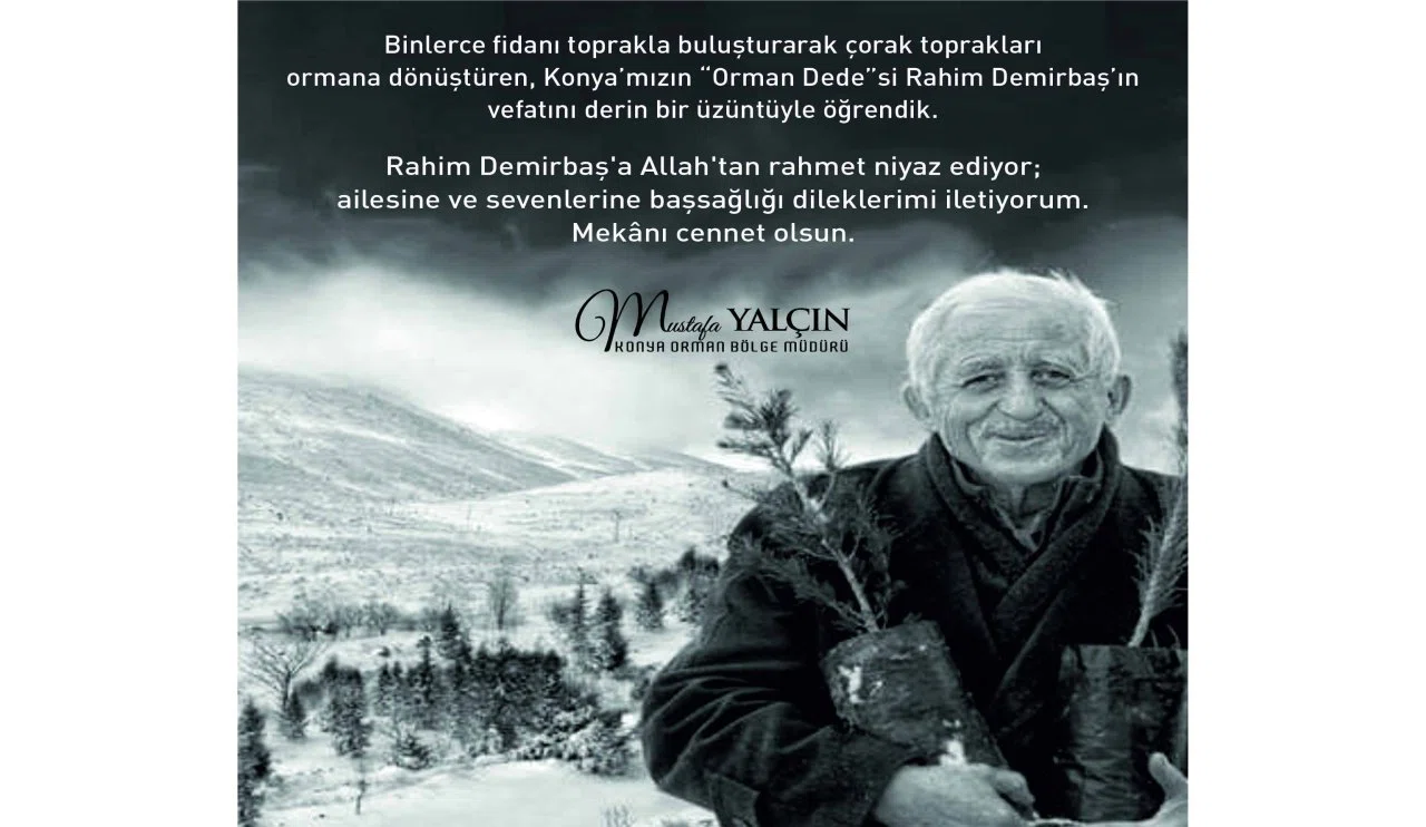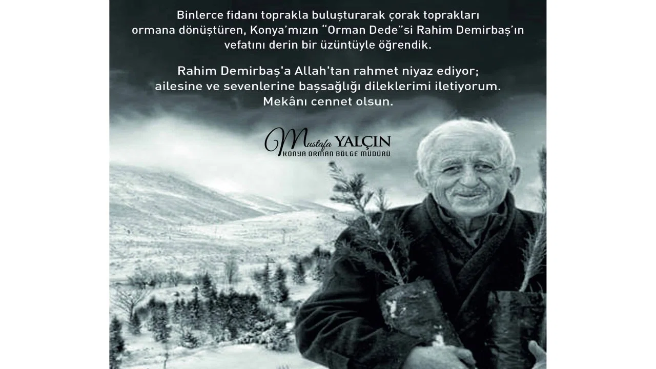 Binlerce fidanı toprakla buluşturarak çorak alanları yeşillendiren Konya’nın “Orman Dede”si olarak tanınan Rahim Demirbaş vefat etti. Konya Orman Bölge Müdürü Mustafa Yalçın, taziye mesajı yayımladı.