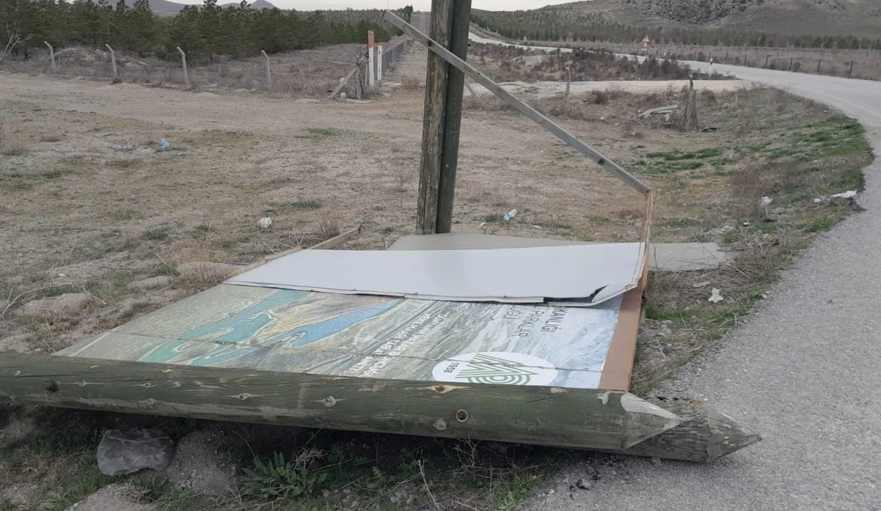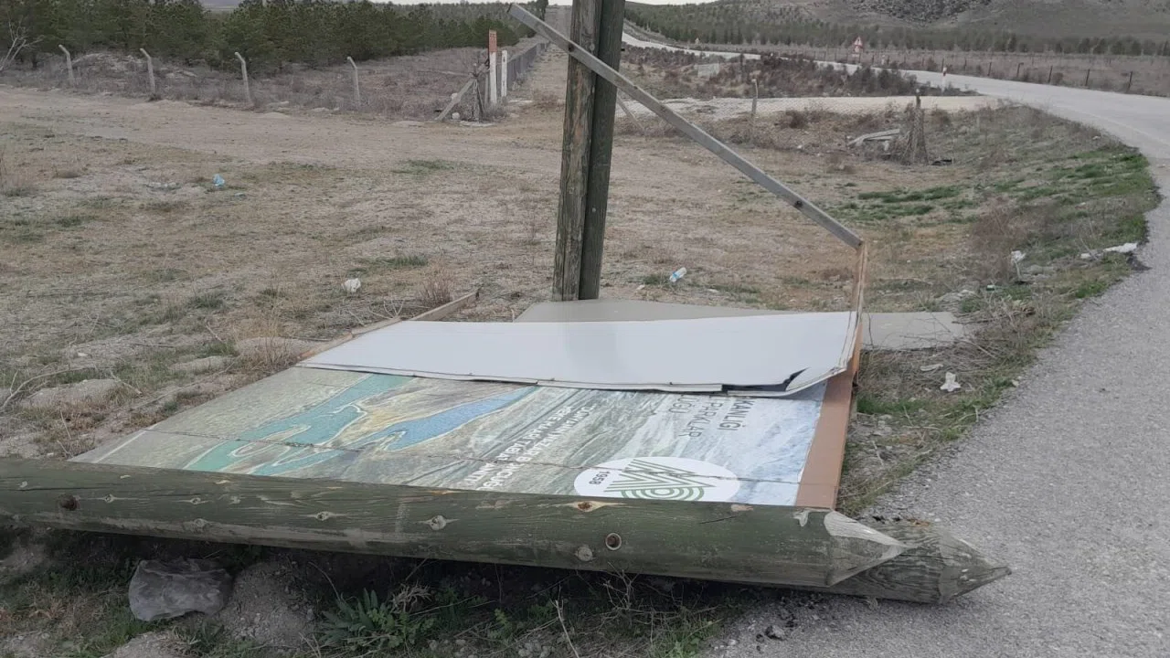 Meteoroloji tarafından yapılan uyarının ardından, Karapınar'daki Meke Gölü girişindeki tanıtım levhası, kuvvetli rüzgarın etkisiyle devrildi.