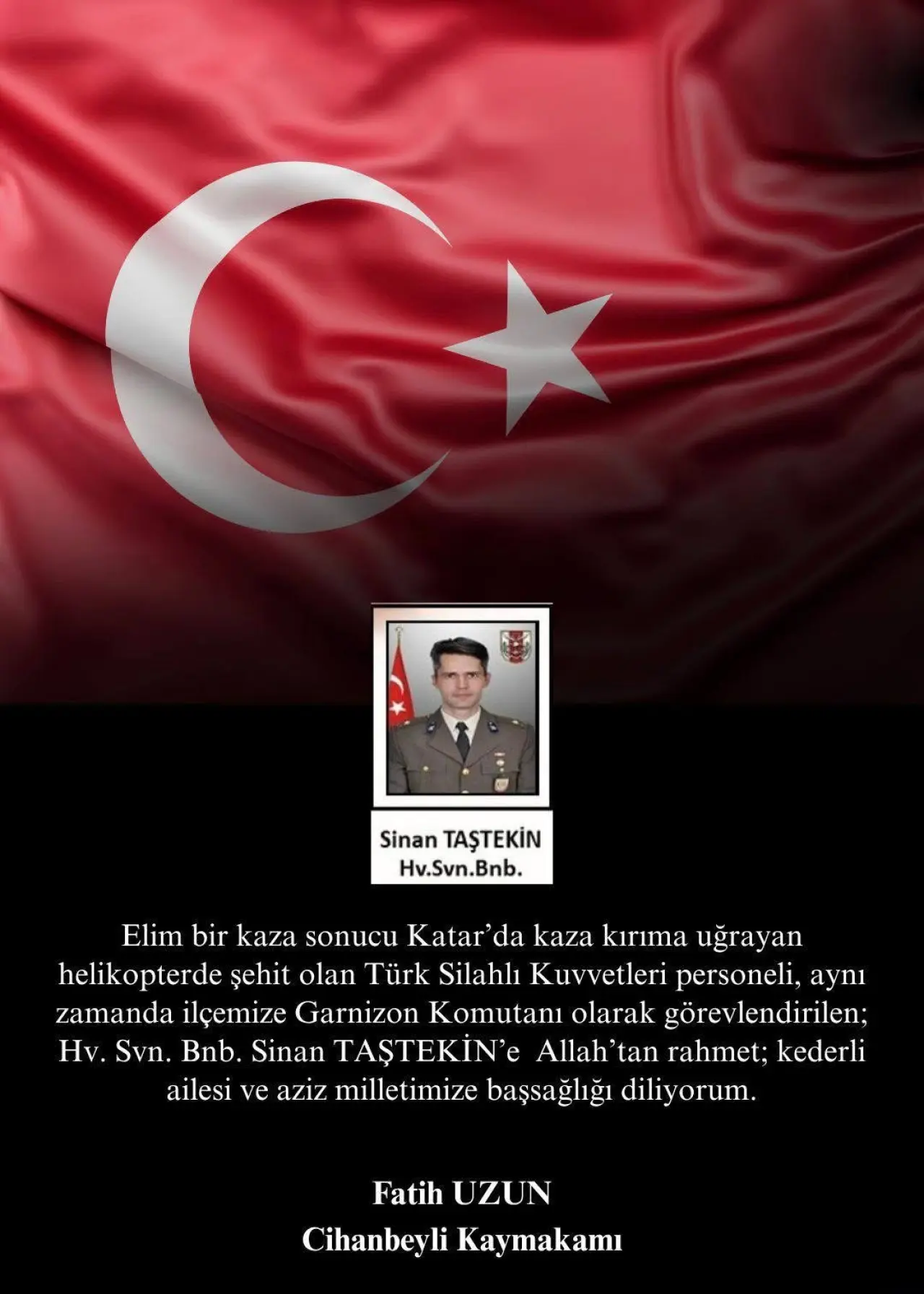 “Elim bir kaza sonucu Katar’da kaza kırıma uğrayan helikopterde şehit olan Türk Silahlı Kuvvetleri personeli, aynı zamanda ilçemize Garnizon Komutanı olarak görevlendirilen Hv. Svn. Bnb. Sinan Taştekin’e Allah’tan rahmet; kederli ailesi ve aziz milletimize başsağlığı diliyorum.”