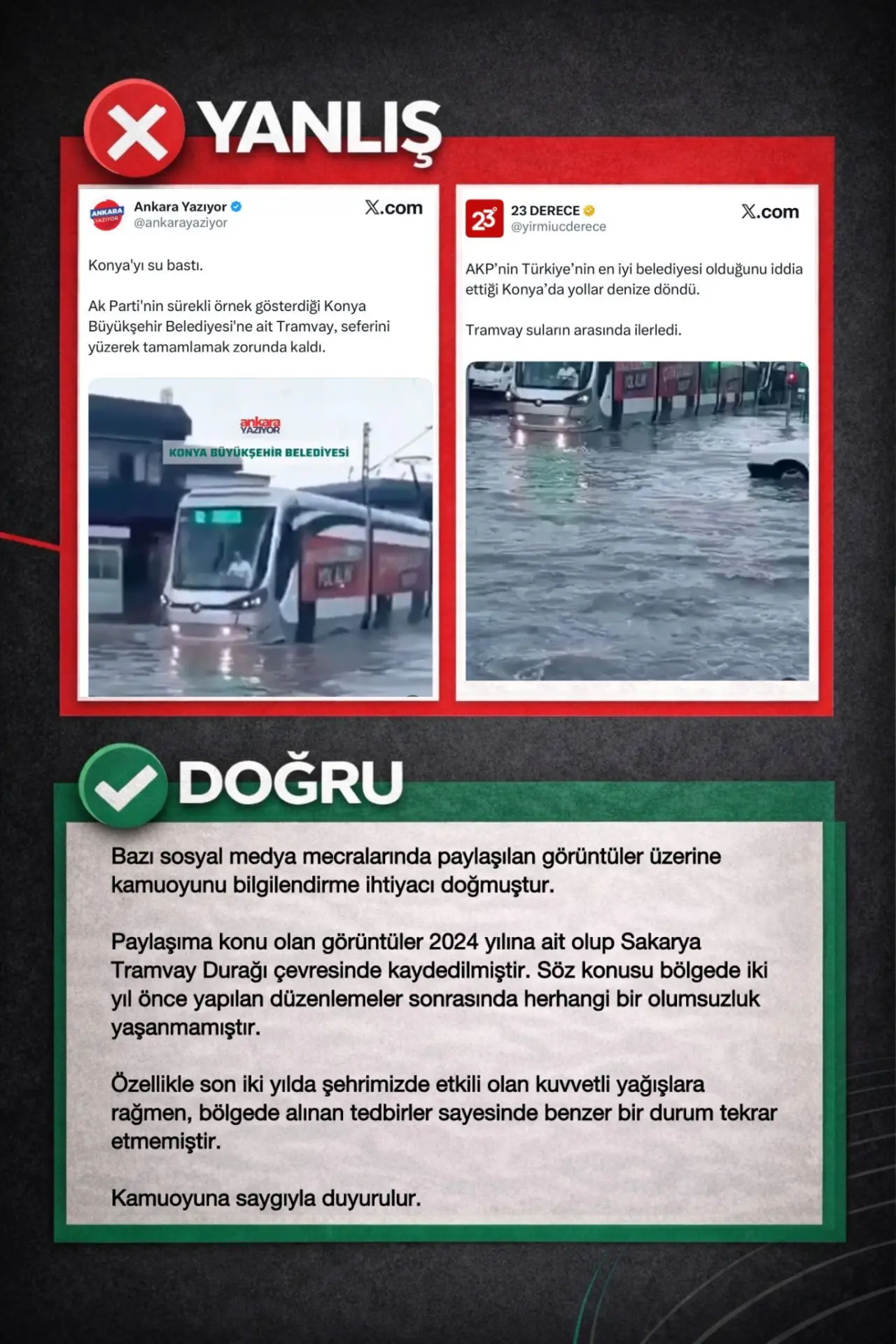 Konya Büyükşehir Belediyesi İletişim Ofisi, son günlerde sosyal medyada paylaşılan ve Konya’da tramvayların su içinde ilerlediğini gösterdiği iddia edilen görüntülere ilişkin kamuoyunu bilgilendiren bir açıklama yaptı.
