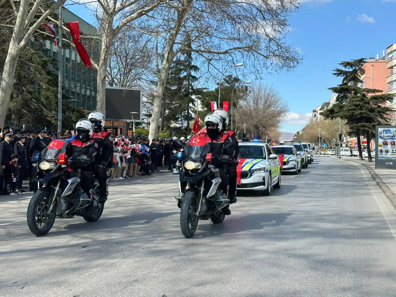 Törenin devamında polis araçları ve motosikletlerinden oluşan kortej, alanda geçiş yaparak katılımcılar tarafından ilgiyle izlendi. Kortej geçişi, programın en dikkat çekici anlarından biri olurken, vatandaşlar tarafından alkışlarla karşılandı.