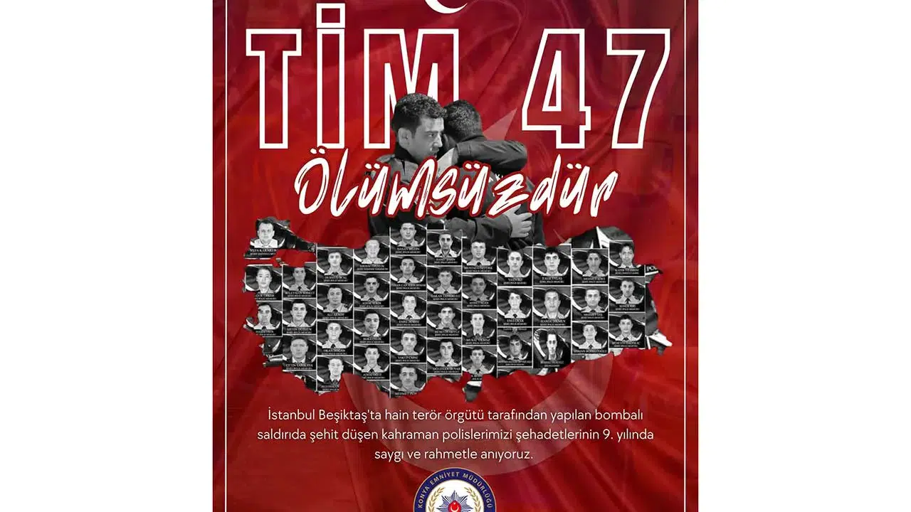Konya İl Emniyet Müdürlüğü, İstanbul Beşiktaş’ta düzenlenen terör saldırısında şehit olan polisleri, şehadetlerinin 9. yılında yayımladığı mesajla andı.