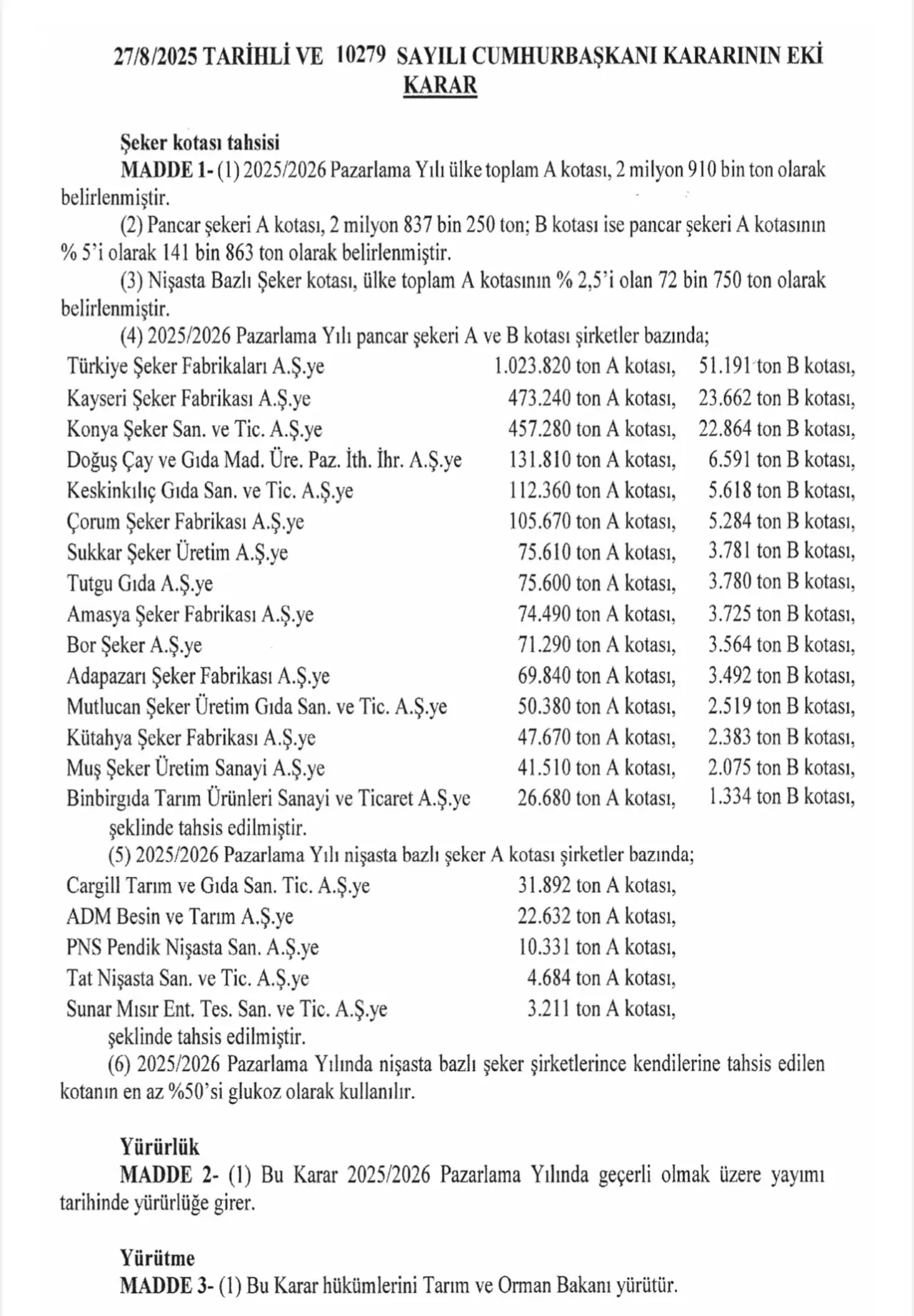Resmi Gazete'de yayımlanan 10279 sayılı Cumhurbaşkanı Kararı ile, 2025/2026 Pazarlama Yılı için şeker kotaları yeniden düzenlendi ve şirket bazında dağılımı detaylandırıldı.