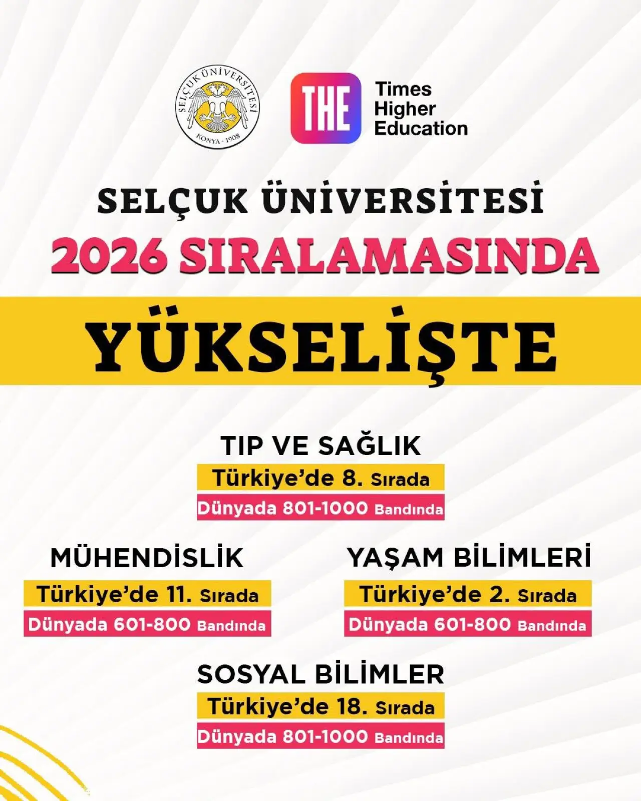 Selçuk Üniversitesi, Times Higher Education (THE) 2026 Alan Sıralamaları’nda önemli bir başarıya imza attı. Üniversite; tıp ve sağlık, mühendislik, yaşam bilimleri ve sosyal bilimler alanlarında hem Türkiye’de hem de dünya genelinde yükselişini sürdürerek araştırma gücünü ve akademik niteliğini bir kez daha uluslararası ölçekte tescillemiş oldu.