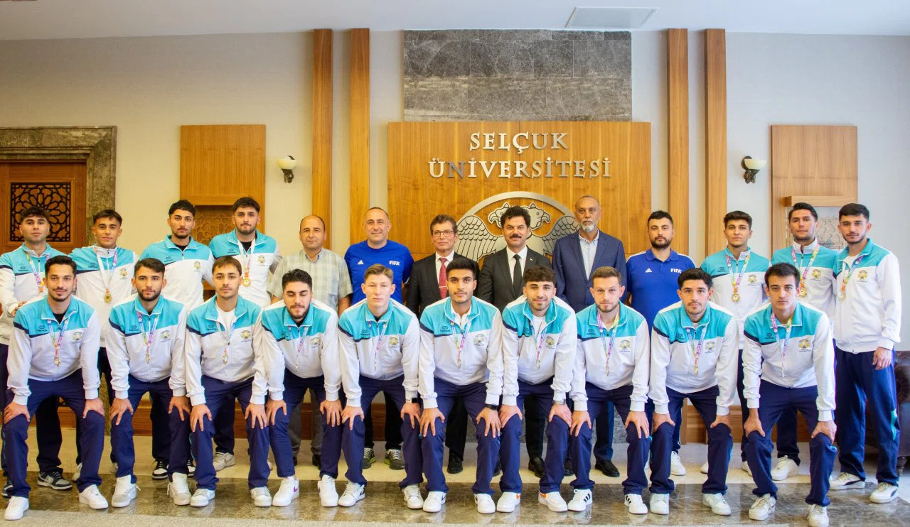Türkiye Üniversiteler Süper Ligi şampiyonu olarak 2026 yılında İtalya’da düzenlenecek Üniversiteler Arası Avrupa Futbol Şampiyonası’nda Türkiye’yi temsil etmeye hak kazanan Selçuk Üniversitesi futbol takımı, Rektör Prof. Dr. Hüseyin Yılmaz’ı ziyaret etti. Ziyarette, Spor Bilimleri Fakültesi Dekanı Prof. Dr. Murat Erdoğdu, antrenörler Dr. Öğr. Üyesi Veysel Böge ve Arş. Gör. Dr. Gökhan Hadi ile Rektör Yardımcısı Prof. Dr. Ahmet Ak da hazır bulundu.