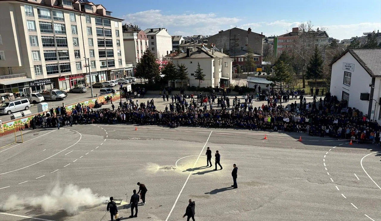 Konuşmaların ardından okul idarecileri, öğretmenler ve öğrencilerin katılımıyla okul bahçesinde tatbikat gerçekleştirildi.