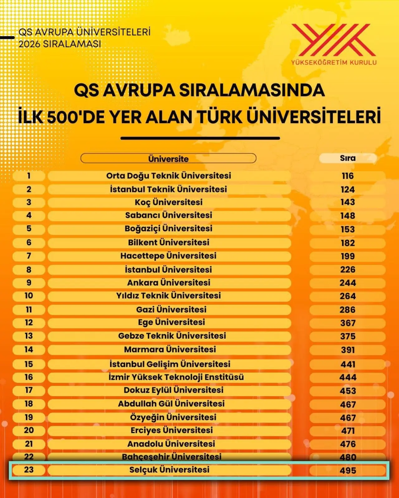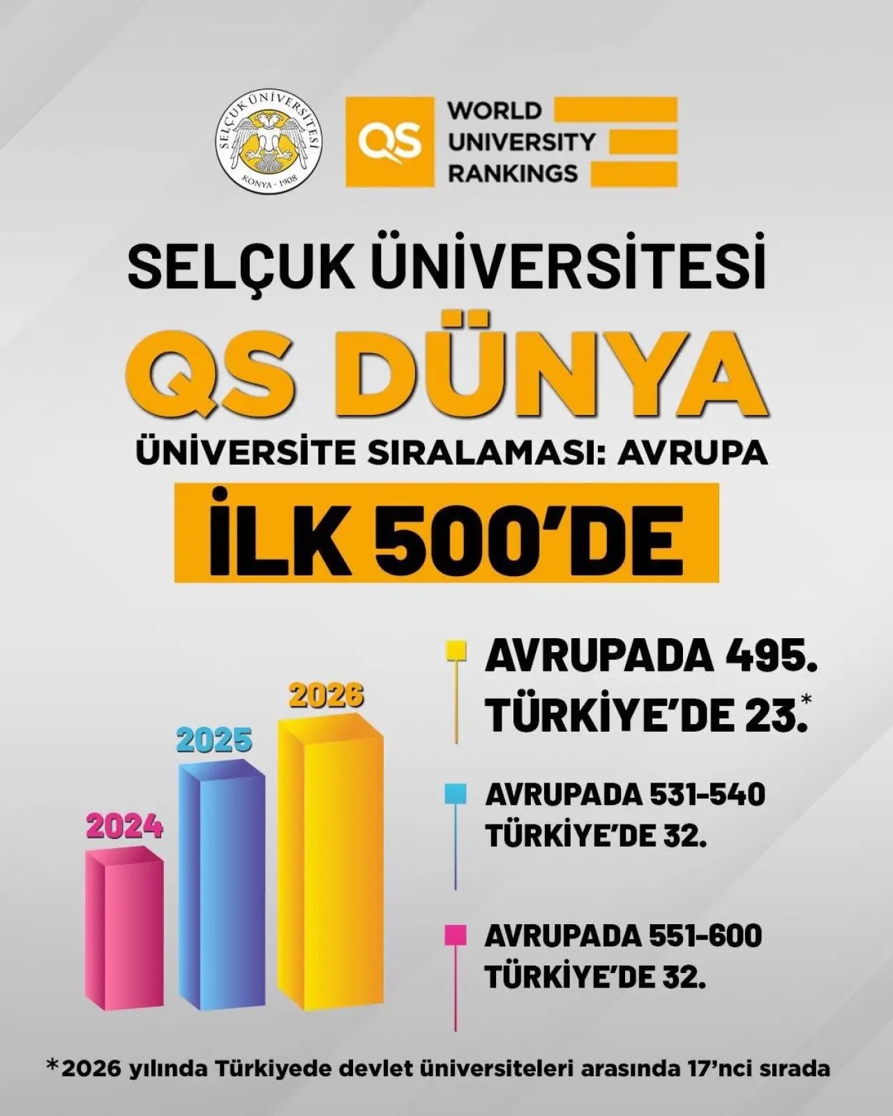Selçuk Üniversitesi, QS Dünya Üniversite Sıralaması’nın Avrupa sonuçlarında ilk 500 üniversite arasına girerek akademik üretim gücünü, araştırma kapasitesini ve uluslararası alandaki yükselen konumunu bir kez daha tescilledi.