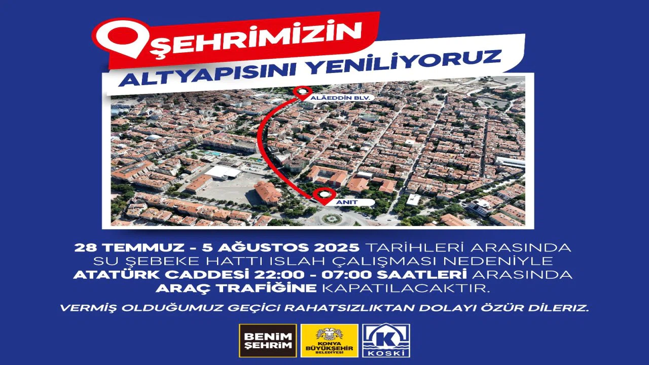 Konya Büyükşehir Belediyesi KOSKİ Genel Müdürlüğü tarafından yapılacak su şebeke hattı ıslah çalışması nedeniyle kent merkezinde önemli bir güzergâh trafiğe kapatılacak.