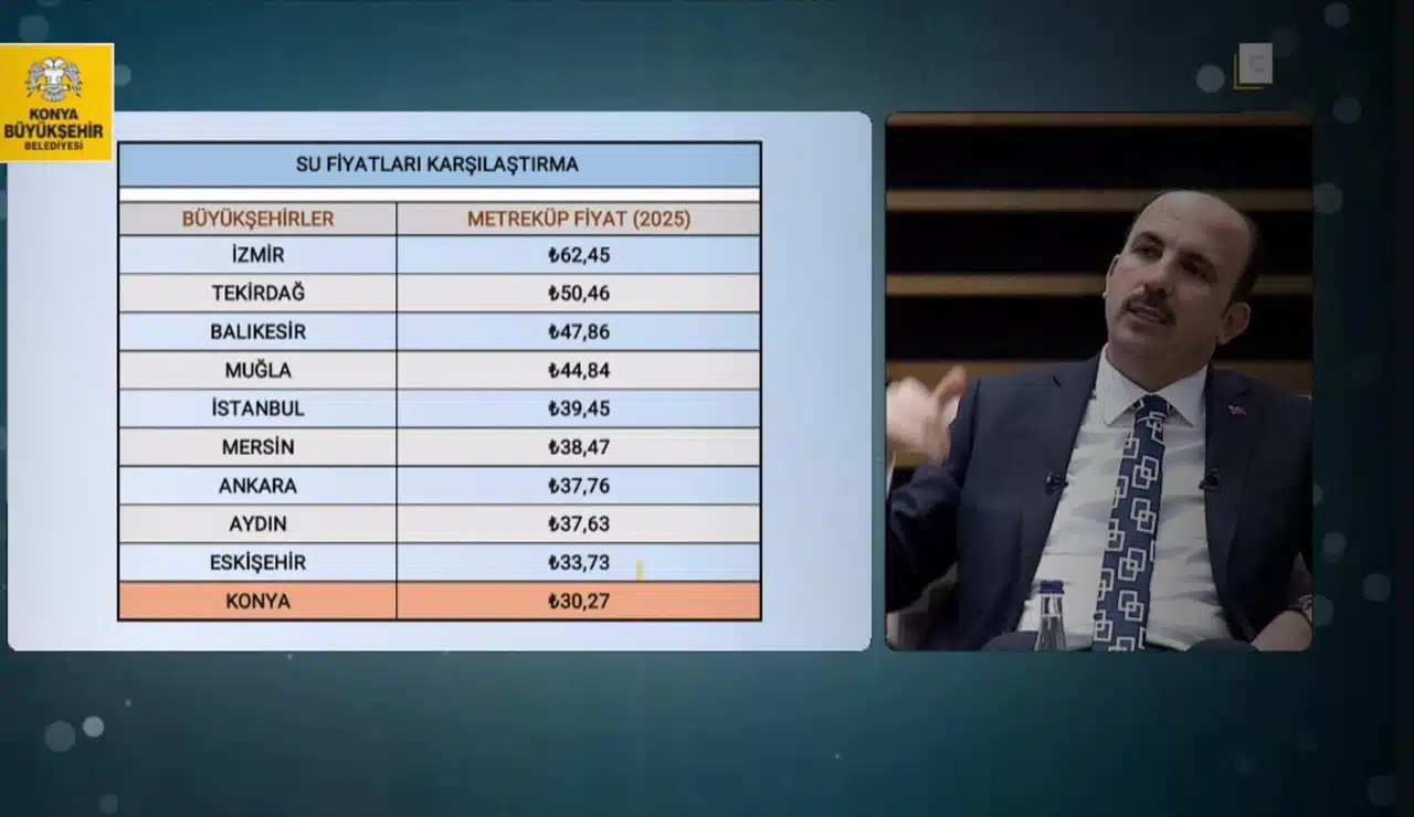 Başkan Altay, su fiyatlarının üç ayda bir güncellendiğini ve Konya’da 2025 yılı için belirlenen metreküp fiyatının 30,27 TL olduğunu söyledi. Diğer büyükşehirlerle kıyaslandığında, Konya'nın su fiyatlarının 30 büyükşehir ortalamasında yer aldığını ifade etti.