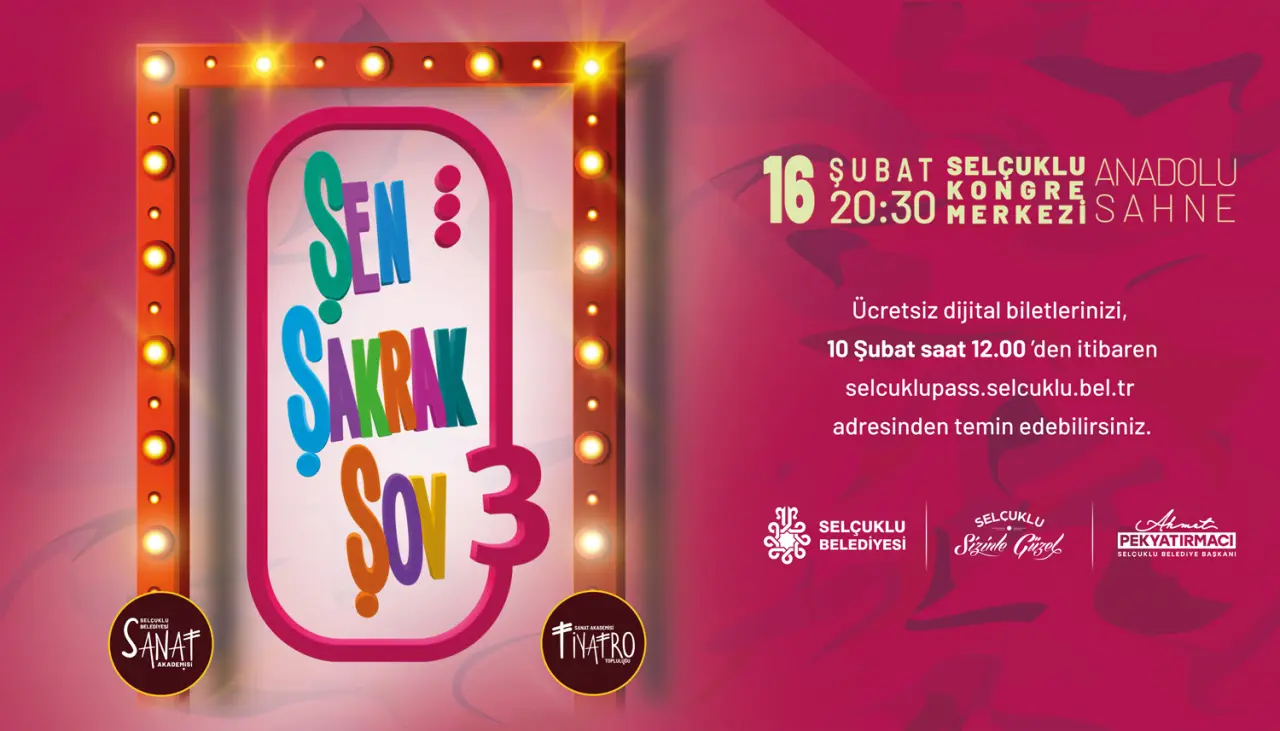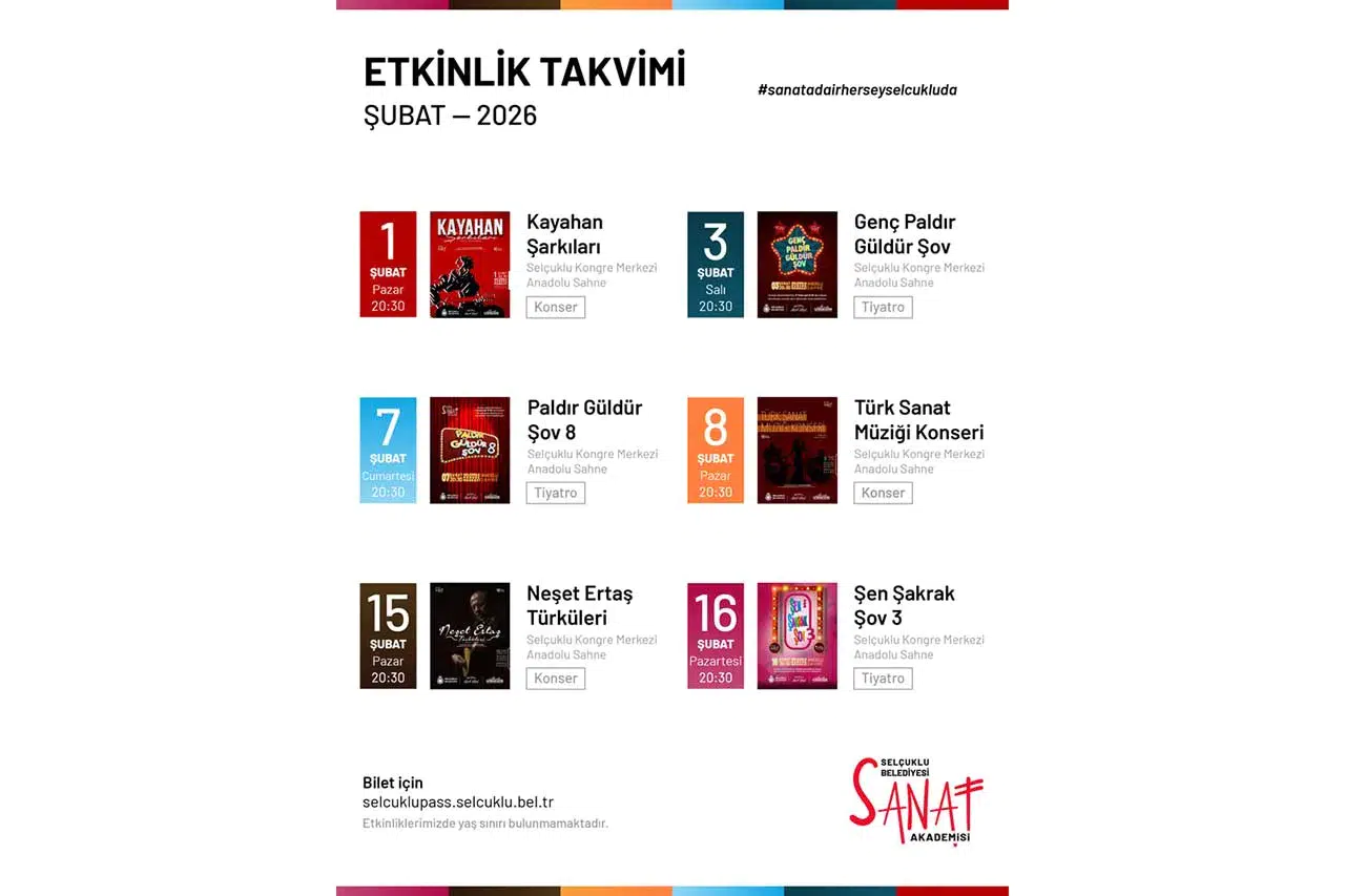 Şubat ayında düzenlenecek etkinlikler kapsamında; 1 Şubat’ta “Kayahan Şarkıları”, 3 Şubat’ta “Genç Paldır Güldür Şov”, 7 Şubat’ta “Paldır Güldür Şov 8”, 8 Şubat’ta “Türk Sanat Müziği Konseri”, 15 Şubatta “Neşet Ertaş Türküleri “, 16 Şubat’ta ise “Şen Şakrak Şov 3” adlı tiyatro oyunu sanatseverlerle buluşacak. Tüm etkinliklerin biletleri belirtilen tarihlerde Selçuklu PASS web sitesi üzerinden ücretsiz olarak temin edilebilecek.