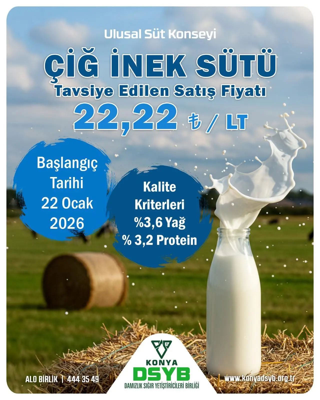 Ulusal Süt Konseyi, 7 Ocak 2026 tarihinde gerçekleştirdiği toplantıda çiğ süt tavsiye satış fiyatını belirledi. Alınan karara göre, 22 Ocak 2026 tarihinden itibaren geçerli olmak üzere, %3,6 yağ ve %3,2 protein içeriğine sahip çiğ inek sütünün net üretici fiyatı (çiğ süt desteği hariç) litre başına 22,22 TL olarak açıklandı.