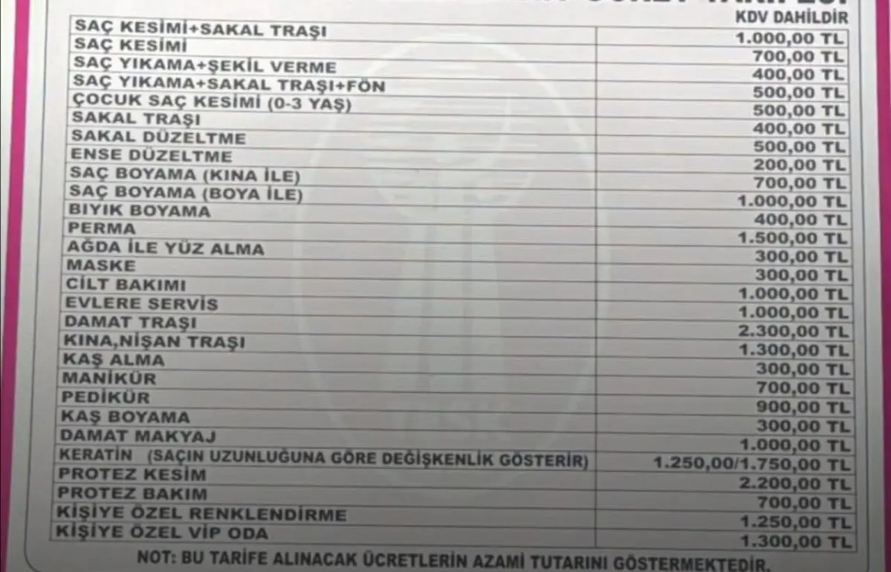 Yeni fiyat listesine göre saç kesimi ve sakal traşı ücreti 1.000 liraya yükseldi. Saç kesimi 700 lira olarak belirlenirken, saç yıkama ve şekil verme ücreti ise 400 lira oldu.