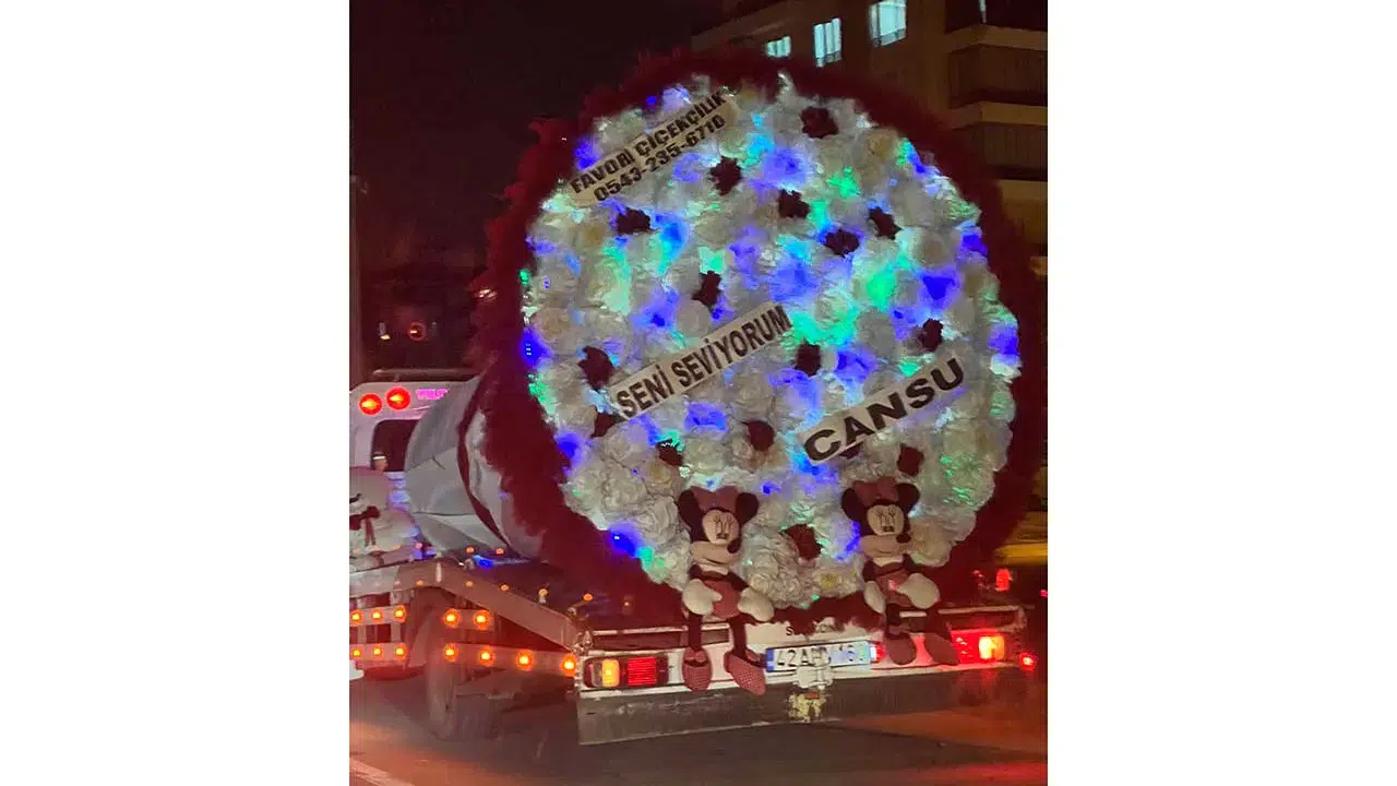 Cep telefonu kamerasına yansıyan görüntülerde, çekicinin araç taşıdığı bölüme ışıklarla donatılmış yapay çiçek buketinin iple bağlandığı görüldü.