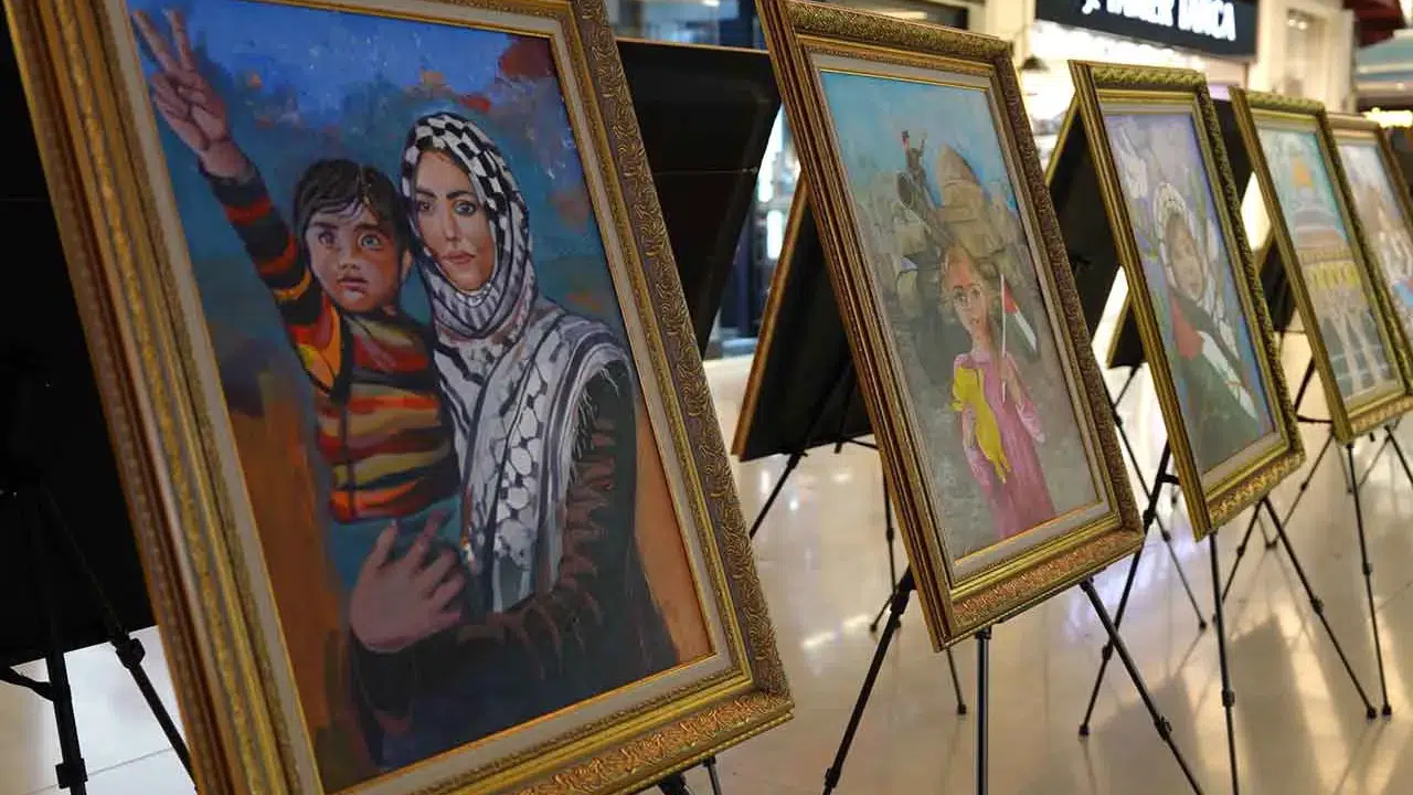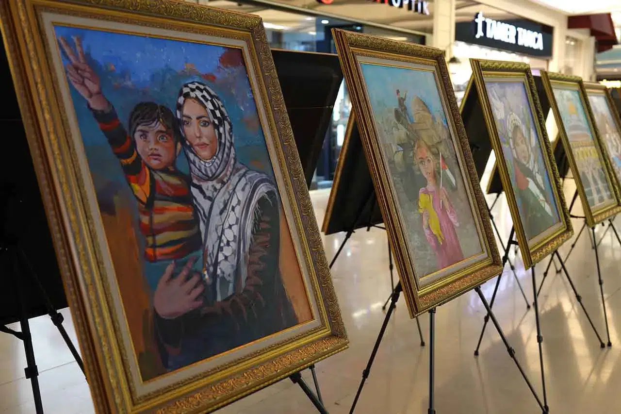 Konya’da misafir edilen 150 Filistinli çocuktan aralarında resim yapma yeteneği bulunanların eserlerinden oluşan resim sergisi, bir alışveriş merkezinde ziyarete açıldı. Çocukların duygu, düşünce ve yaşadıkları zorlukları sanat yoluyla ifade ettikleri birbirinden güzel 20 eserin yer aldığı sergi vatandaşlar tarafından da ilgiyle karşılandı.