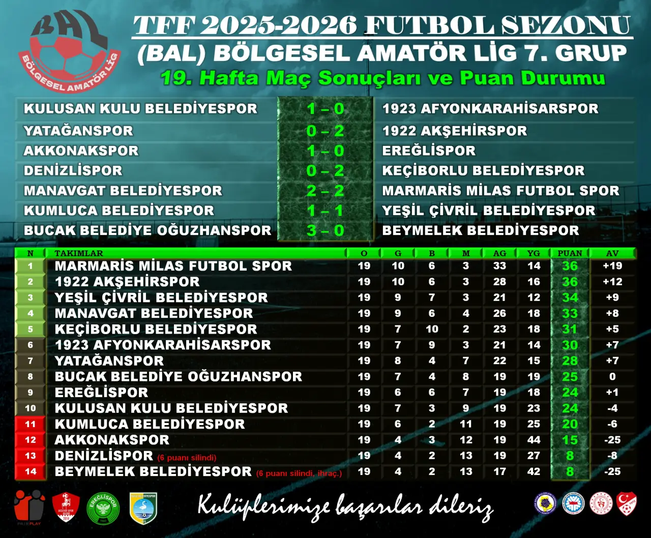 7. Grup’ta yer alan Konya ekiplerinden 1922 Akşehirspor ve ulusan Kulu Belediyespor kazanırken, FDM Yapı Ereğlispor yine mağlup oldu. Niyazi Kart yönetiminde muhteşem bir çıkışa imza atan 1922 Akşehirspor, deplasmanda Muğla ekibi Yatağanspor ile karşılaştı. Kırmızı-beyazlı ekip, rakibini 2-0 mağlup ederek puanını 36’ya çıkardı. Galibiyeti getiren golleri Kadir Canbaz ve Alper Önal kaydetti. Galibiyet serisini 5 maça çıkaran 1922 Akşehirspor, zirveyi Milas FK ile paylaşıyor.